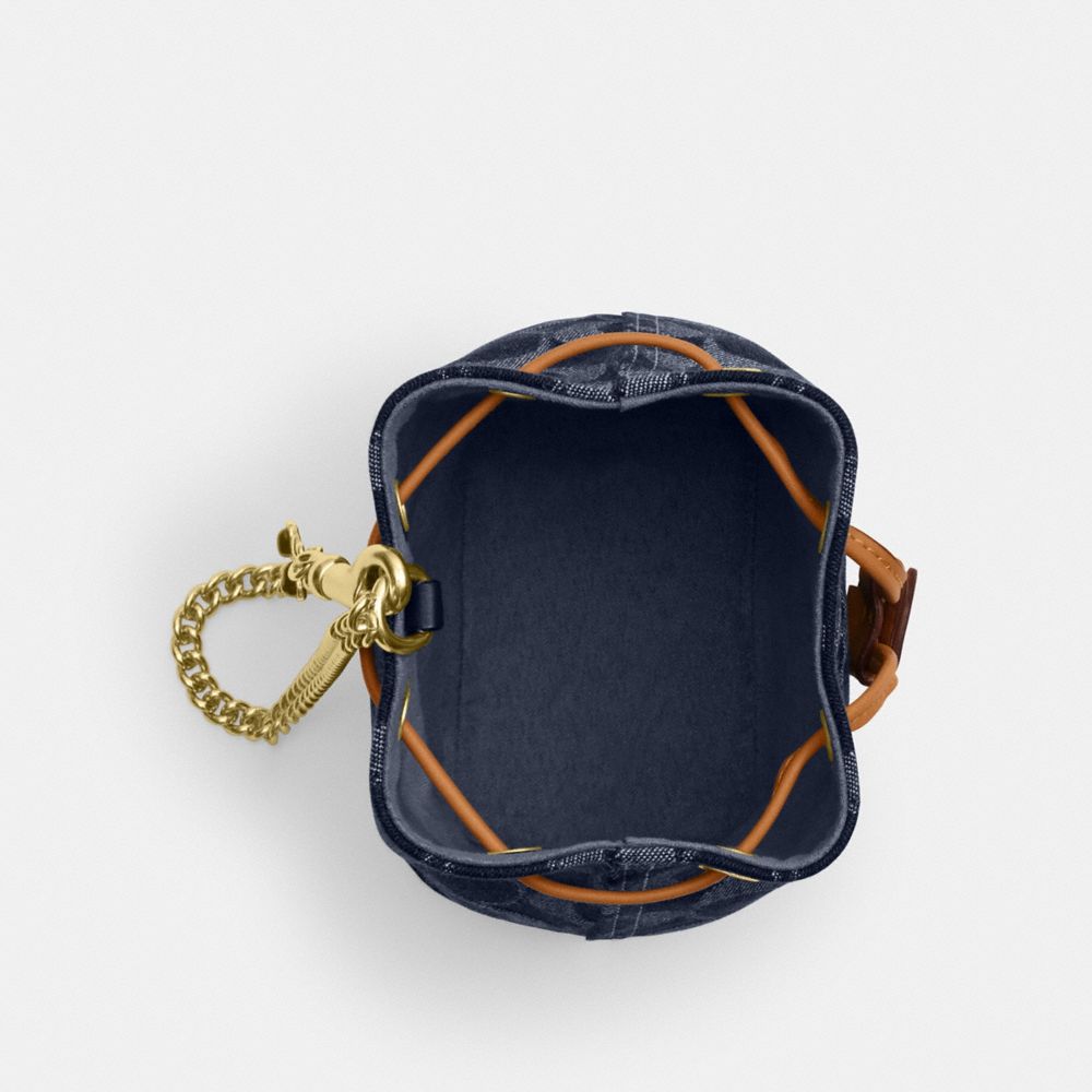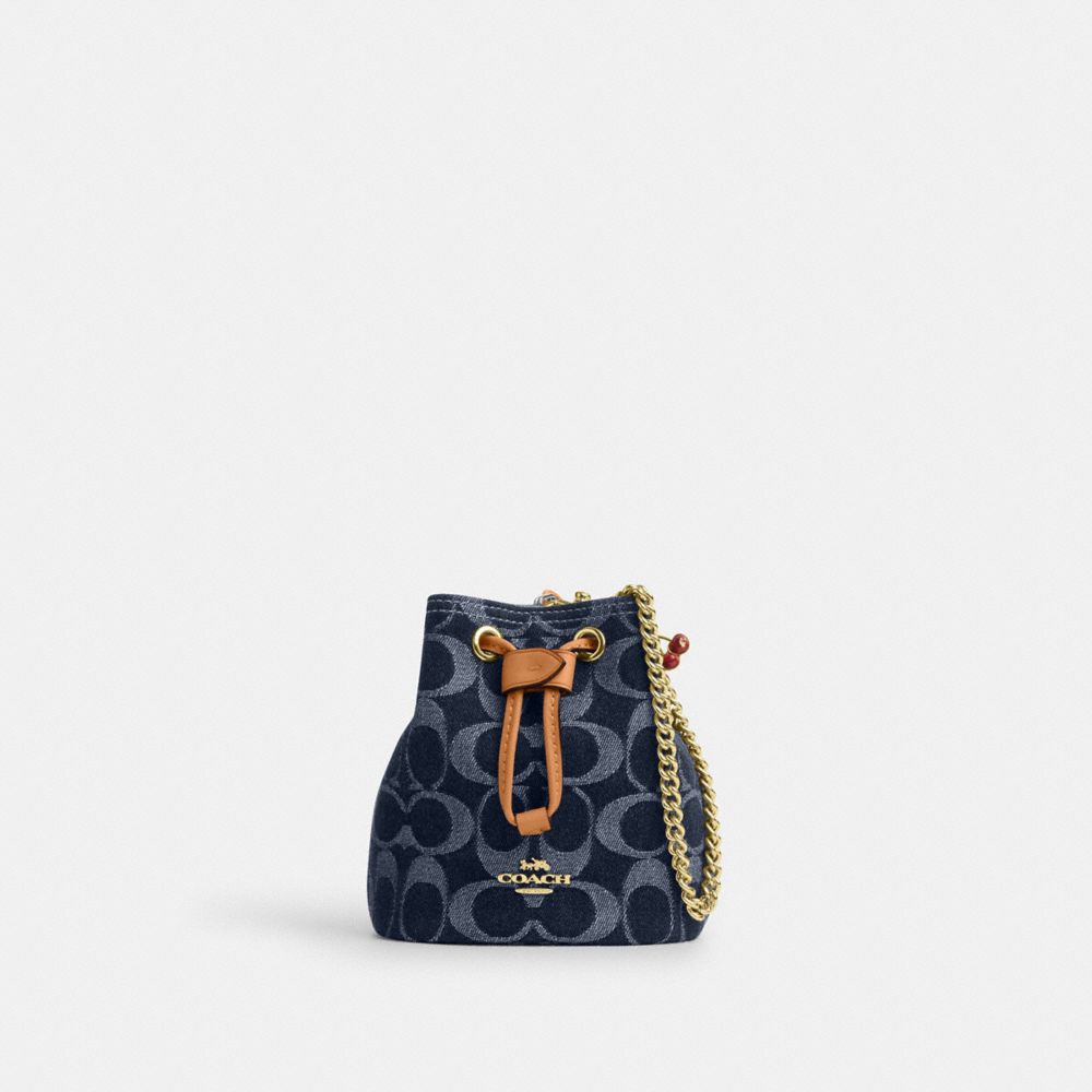| Signature denim, vachetta leather and smooth leather | Drawstring closure, fabric lining | Wrist strap attached | 4 3/4" (L) x 5" (H) x 3 1/4" (W) | Exclusive of trim, this denim style is crafted of cotton sourced from farms that use regenerative agricultural practices—those that help to maintain and rejuvenate land, increase biological diversity and soil health and could lead to increased carbon absorption|Style No. CZ031|