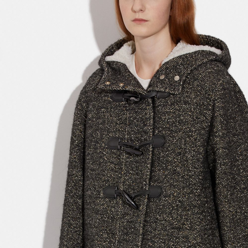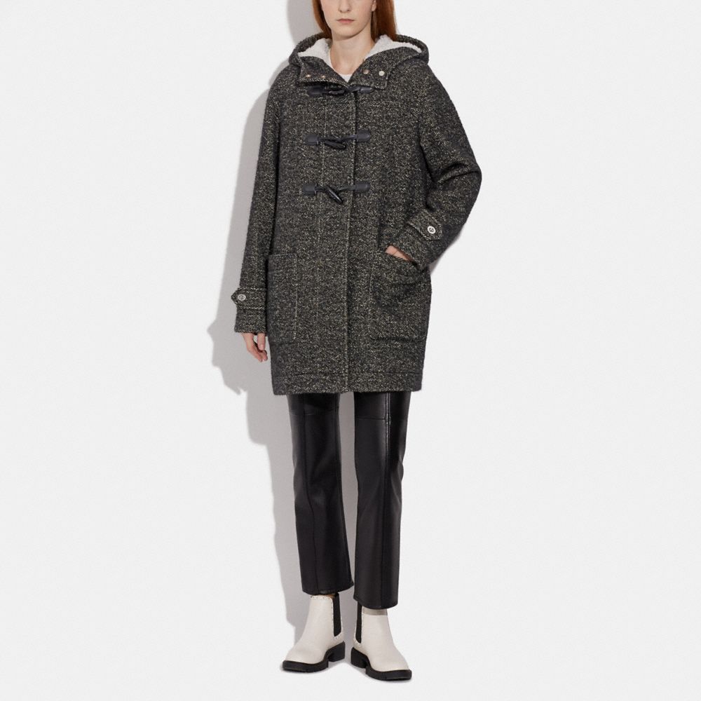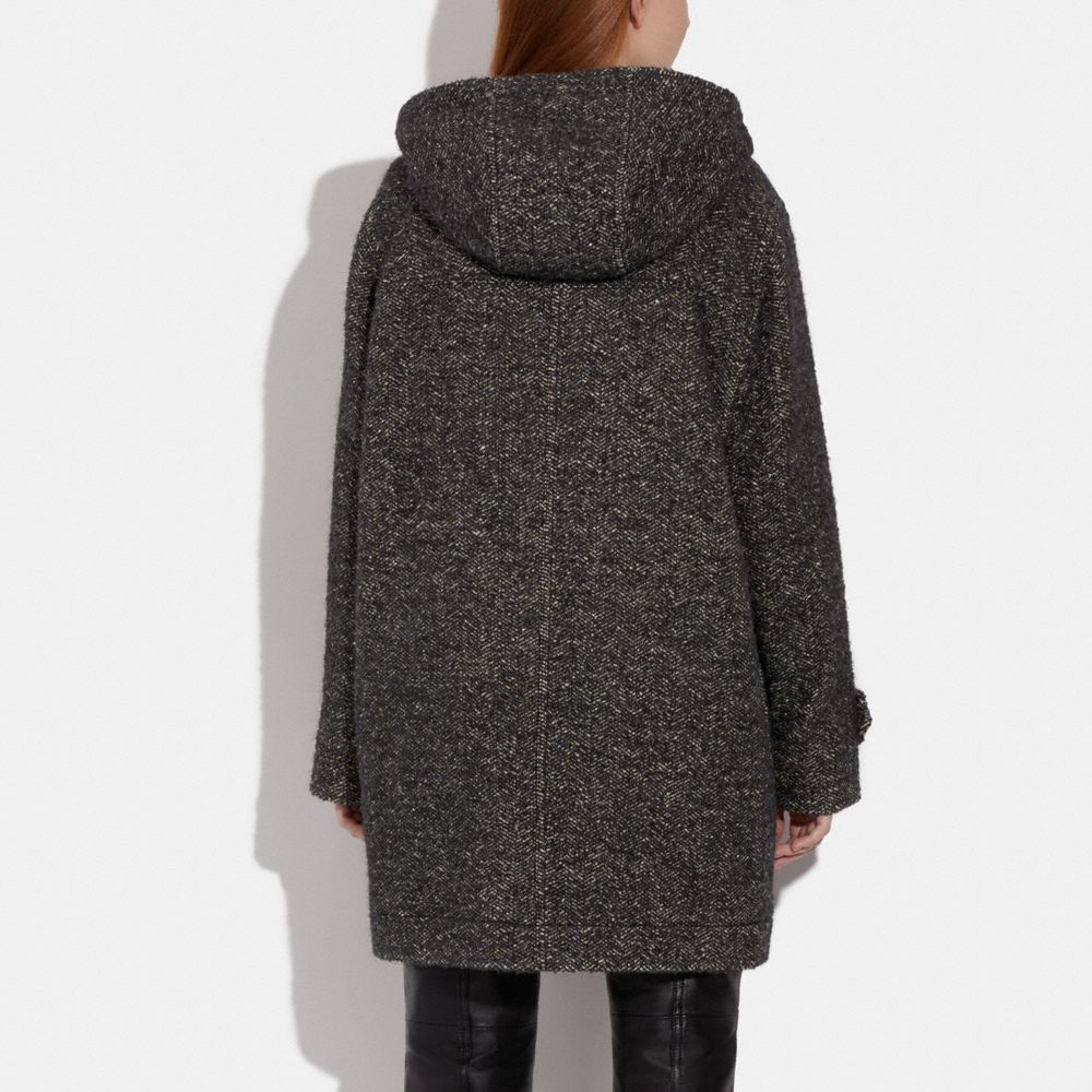 | 42% wool, 25% acrylic, 21% polyester, 5% polyamide, 5% alpaca, 1% mohair, 1% other fibers | Signature lining: 56% polyester, 44% viscose | Hood lining: 100% polyester | Leather details | Toggle and zip closures | Slip pockets | Length: 35 1/2"|Style No. CF483|