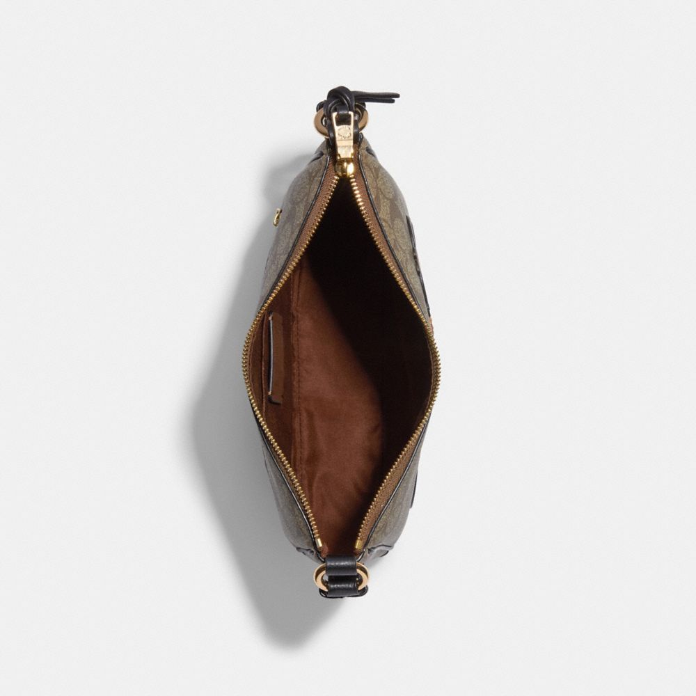 | Signature coated canvas, refined pebble leather and smooth leather | Inside multifunction pocket | Zip-top closure, fabric lining | Outside zip pocket | Adjustable strap with 21" drop for shoulder or crossbody wear | 10 1/4" (L) x 9 1/2" (H) x 2 3/4" (W)|Style No. C6919|