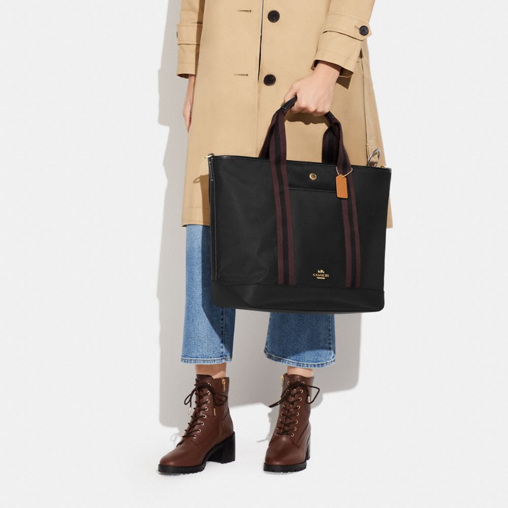| Recycled nylon twill and refined pebble leather | Inside zip and multifunction pockets | Zip-top closure, fabric lining | Handles with 6" drop | Outside open pockets | Detachable strap with 15 1/4" drop for shoulder or crossbody wear | 14 1/4" (L) x 13 1/2" (H) x 6 1/4" (W)|Style No. CA204|