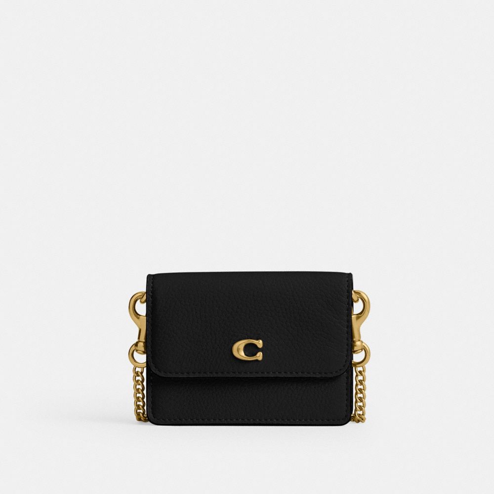 | Polished pebble leather | One credit card slot | Snap closure, leather lining | Outside slip pocket | Detachable chain strap with 21" drop for shoulder or crossbody wear | 4" (L) x 3" (H) x 1" (W)|Style No. CR538|