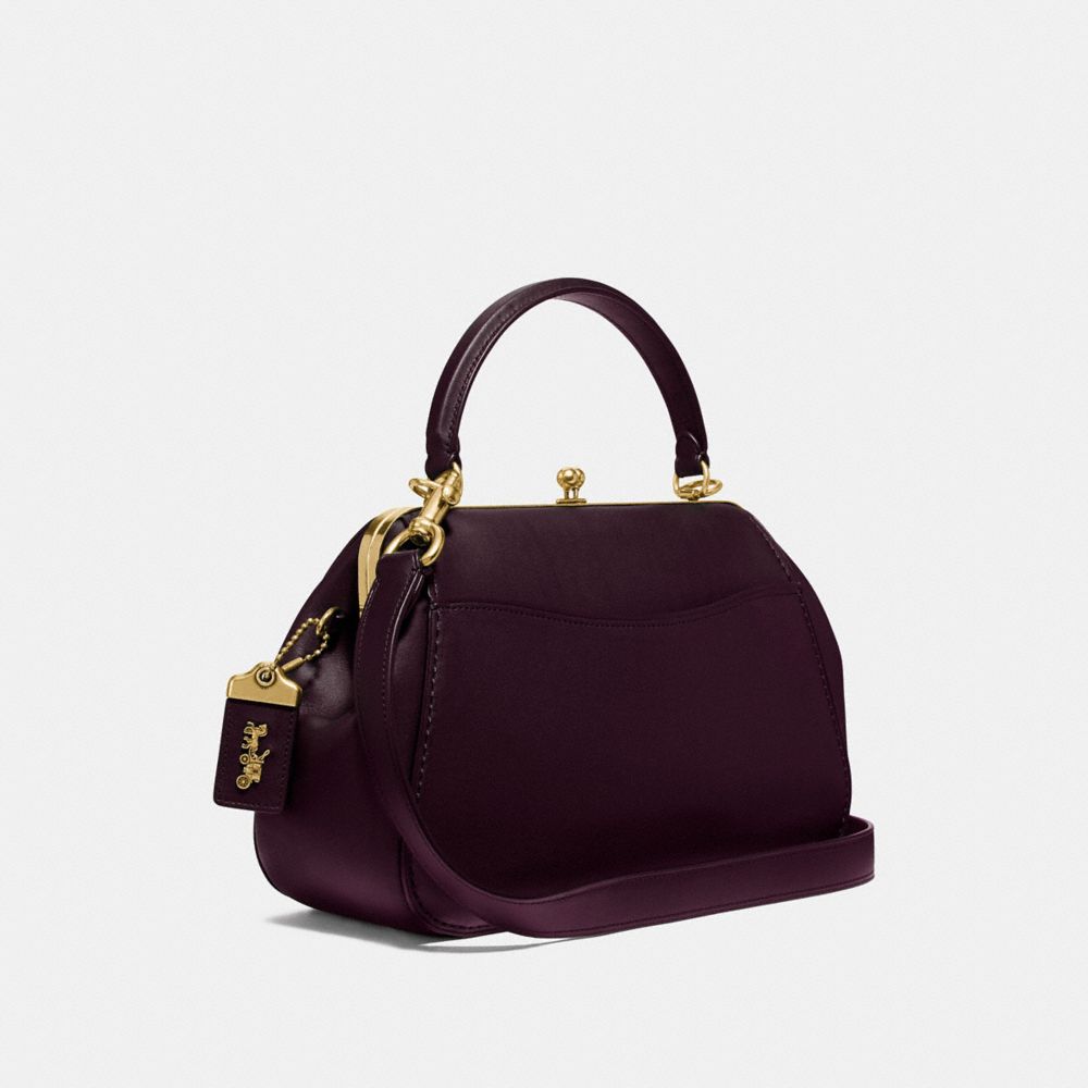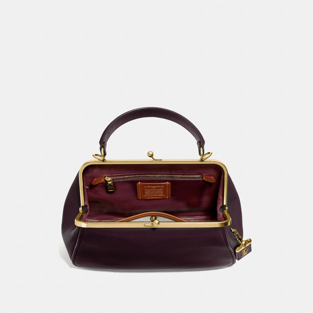 Glovetanned leather| Inside zip and multifunction pockets| Kisslock closure, leather lining| Handle with 4" drop| Outside slip pocket| Detachable strap with 22 1/2" drop for shoulder or crossbody wear| 11 1/2" (L) x 7 1/2" (H) x 4 1/4" (W)