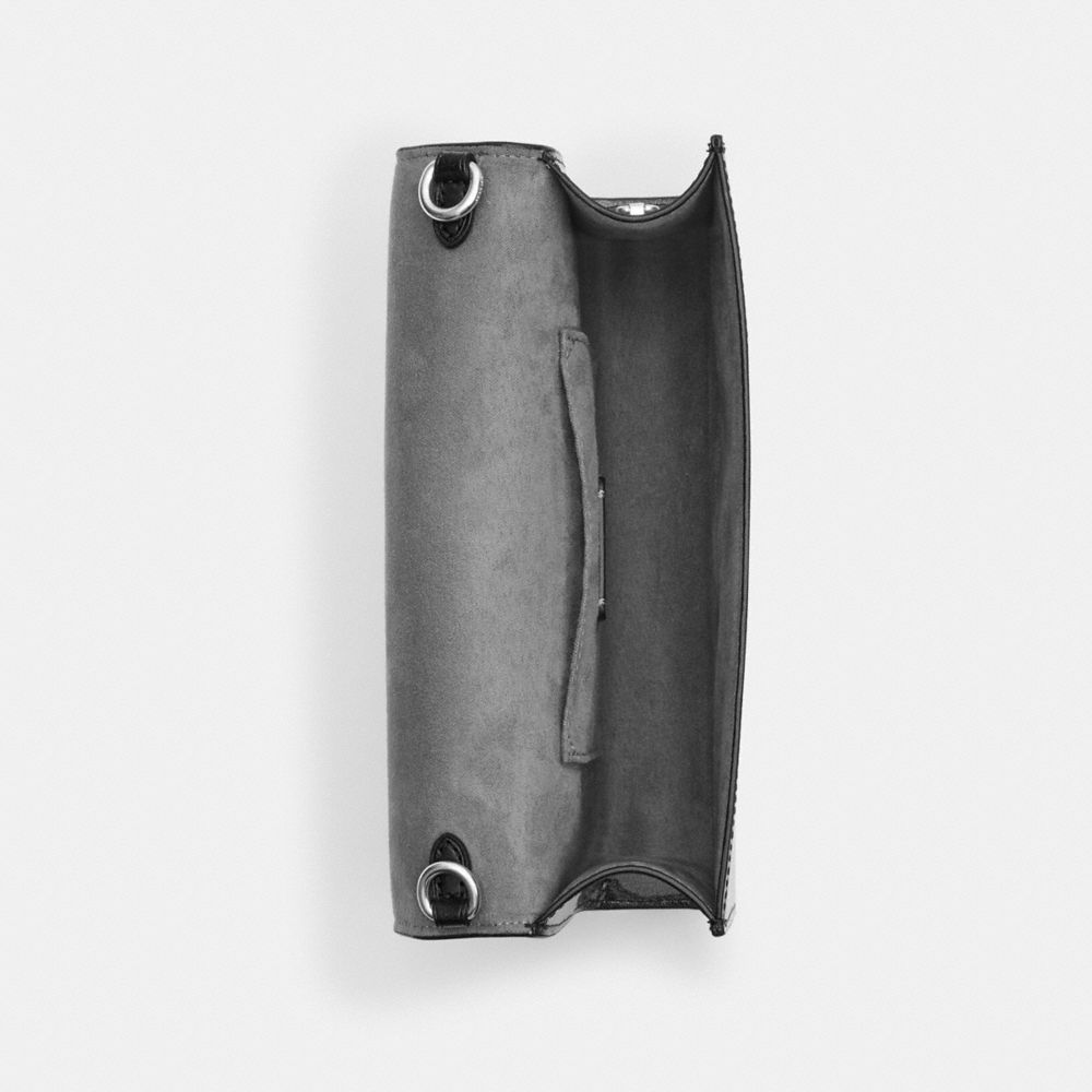 | Glitter patent leather and smooth leather | Inside multifunction pocket | Snap closure, fabric lining | Outside open pocket | Detachable strap with 21 3/4" drop for shoulder or crossbody wear | 8 1/2" (L) x 5 1/4" (H) x 2" (W)|Style No. CP032|