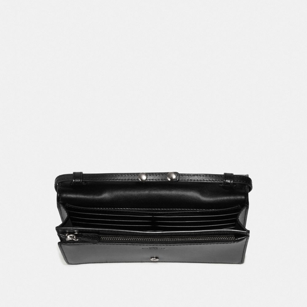 Printed coated canvas with smooth leather details| Eight credit card slots| Full-length bill compartment| Inside zip pocket| Snap closure| Outside slip pocket| Detachable strap with 23" drop for shoulder or crossbody wear| 8" (L) x 4 3/4" (H) x 1 1/2" (W)