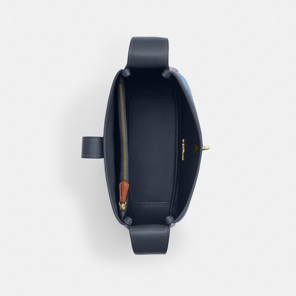 Signature denim and smooth leather| Inside zip pocket| Turnlock closure, fabric lining| Adjustable strap with 20 1/2" drop for shoulder or crossbody wear| 9 3/4" (L) x 9 1/2" (H) x 3 1/4" (W)| Exclusive of trim, this denim style is crafted of cotton sourced from farms that use regenerative agricultural practices—those that help to maintain and rejuvenate land, increase biological diversity and soil health and could lead to increased carbon absorption|Style No. CDB98
