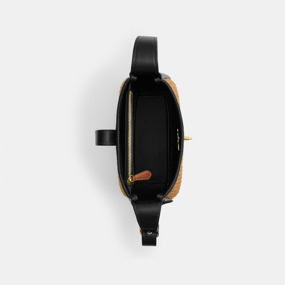 | Straw and refined pebble leather | Inside zip pocket | Turnlock closure, fabric lining | Adjustable strap with 22" drop for shoulder or crossbody wear | 7 3/4" (L) x 7 1/2" (H) x 2 3/4" (W)|Style No. CAL61|