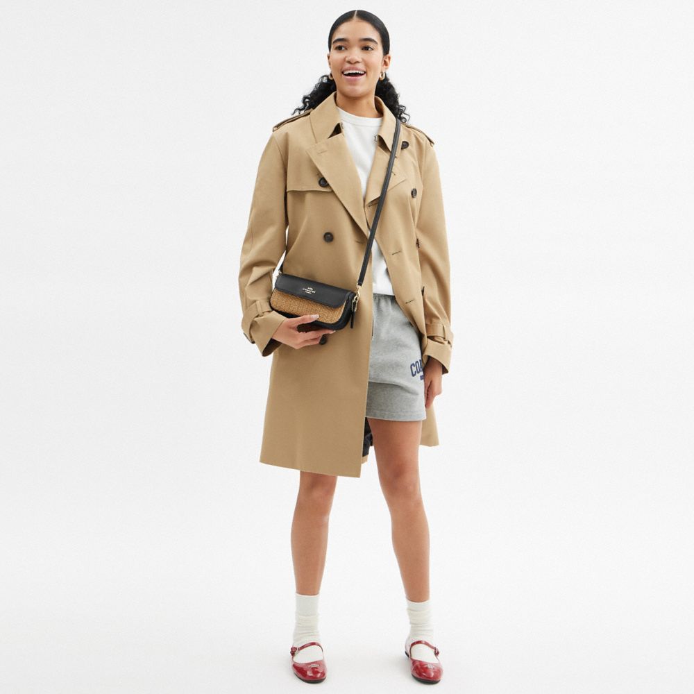 | Straw and refined pebble leather | Inside open pocket | Snap closure, fabric lining | Detachable handle with 8 1/4" drop | Outside open pocket | Detachable strap with 22 1/2" drop for shoulder or crossbody wear | 7 3/4" (L) x 4 1/4" (H) x 2" (W)|Style No. CAN69|