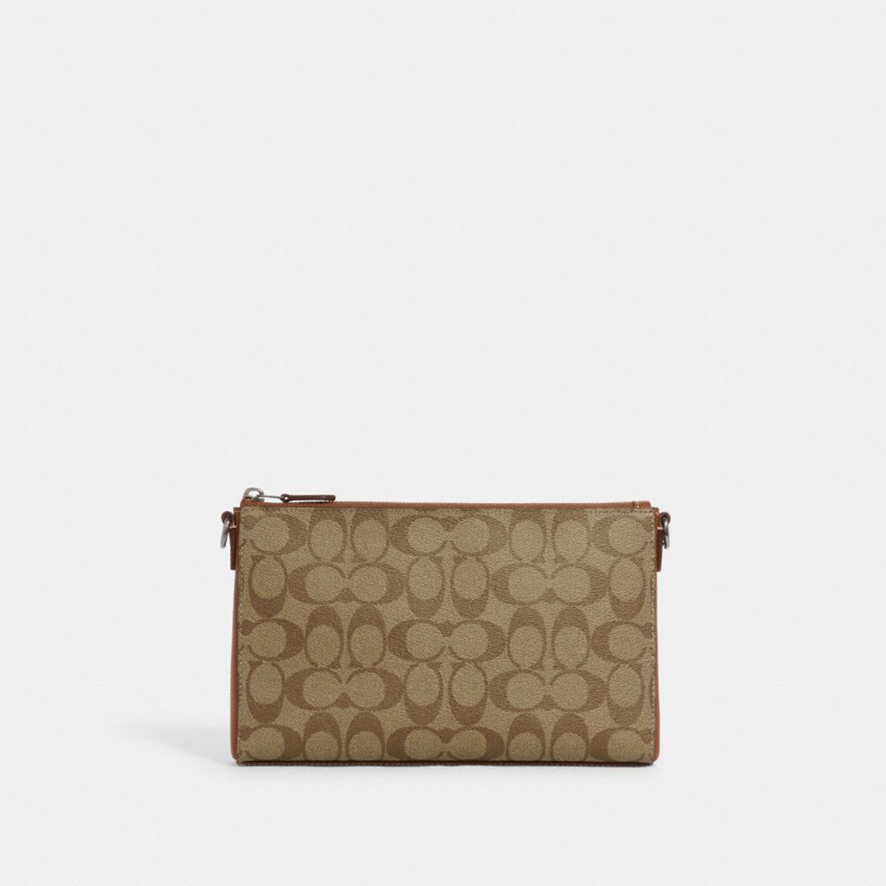 | Signature coated canvas and refined pebble leather | Zip-top closure, fabric lining | Detachable chain handle with 4 3/4" drop | Outside zip pocket | Detachable strap with 24" drop for shoulder or crossbody wear | 9 3/4" (L) x 6" (H) x 1 1/2" (W) | Detachable round coin case: | Zip closure, fabric lining | 3 1/2" (L) x 3 1/2" (H) x 1" (W)|Style No. CG997|