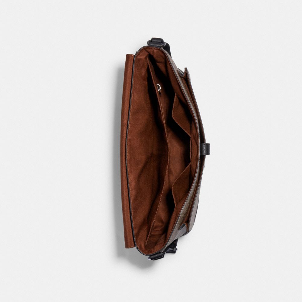 Signature coated canvas and natural pebble leather| Inside zip, cell phone and multifunction pockets| Inside laptop sleeve| Flap closure, fabric lining| Outside magnetic snap pocket| Adjustable strap with 25" drop for shoulder or crossbody wear| 13 1/2" (L) x 9 3/4" (H) x 3 1/2" (W)Style No. C8142