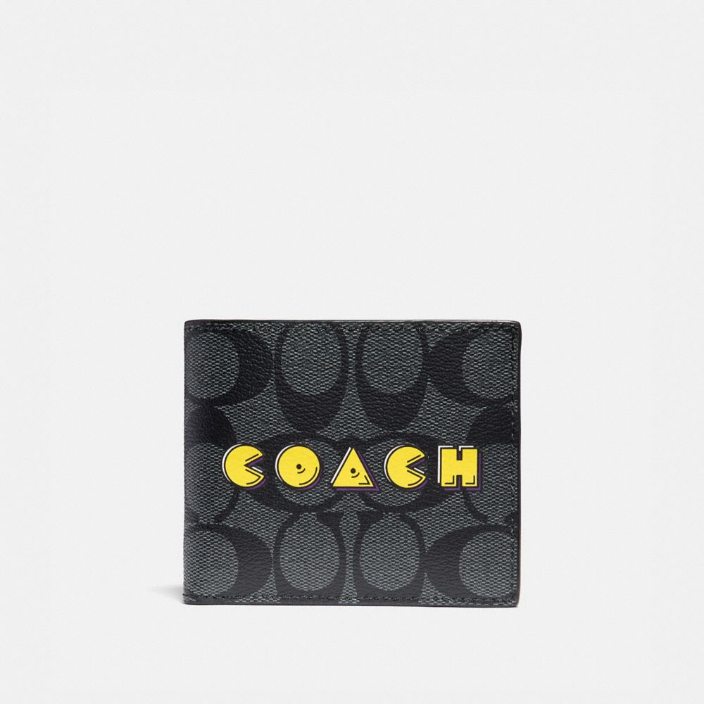 ID BILLFOLD WALLET IN SIGNATURE CANVAS WITH PAC-MAN COACH SCRIPT (COACH F75912)