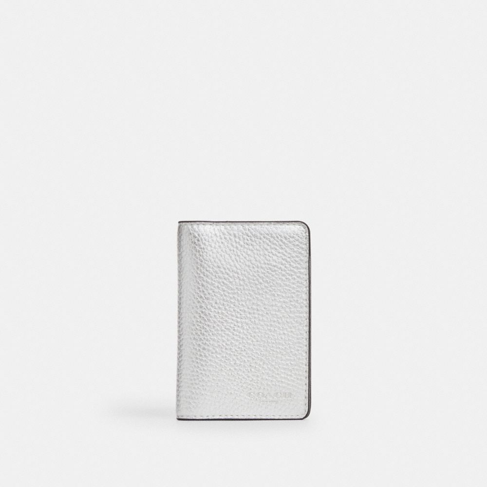 | Metallic refined pebble leather and metallic refined calf leather | Three credit card slots | ID window | Outside open pocket | 3" (L) x 4 1/2" (H)|Style No. CO781|