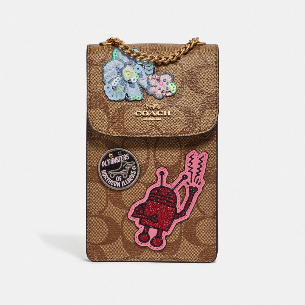 KEITH HARING NORTH/SOUTH PHONE CROSSBODY IN SIGNATURE CANVAS WITH PATCHES (COACH F39955)