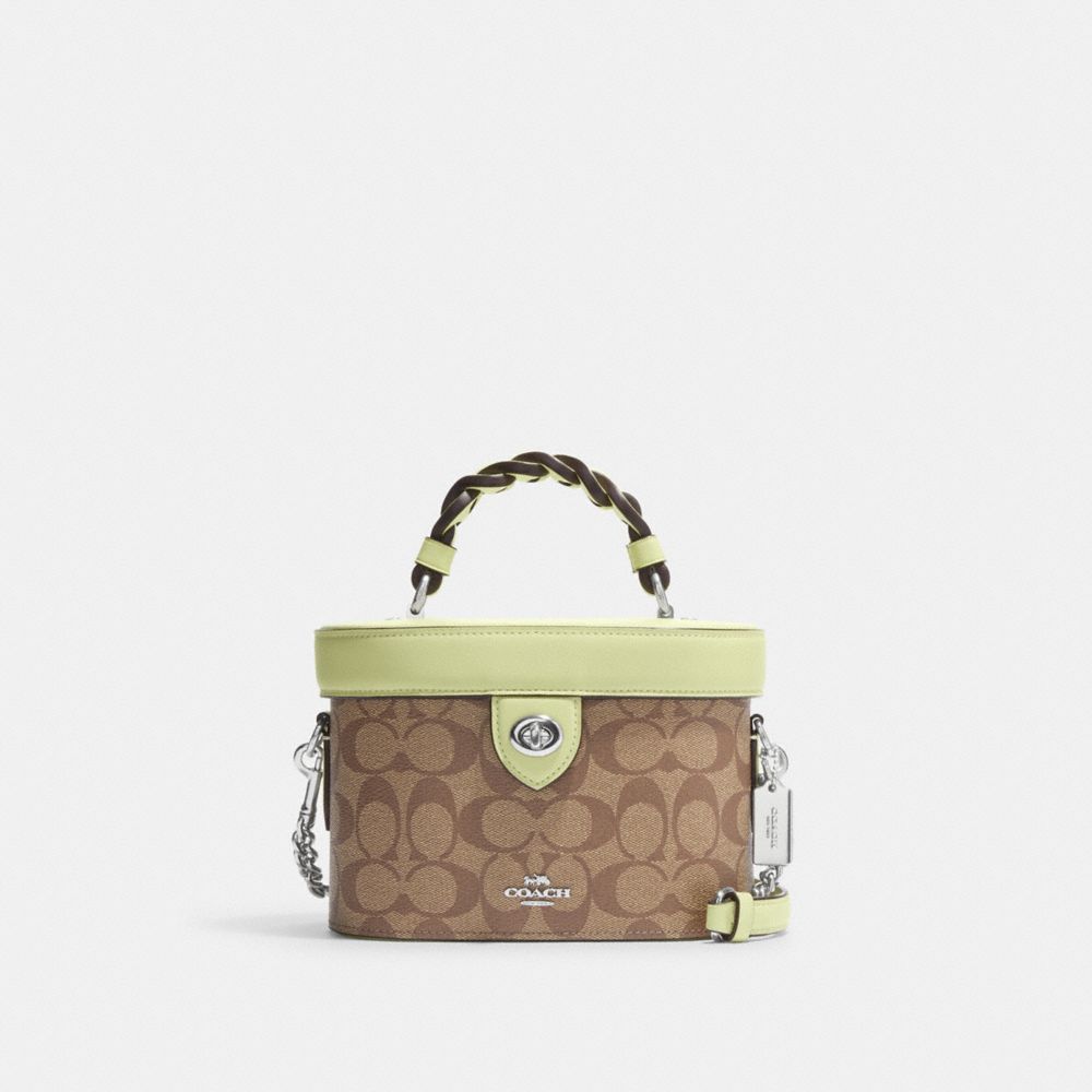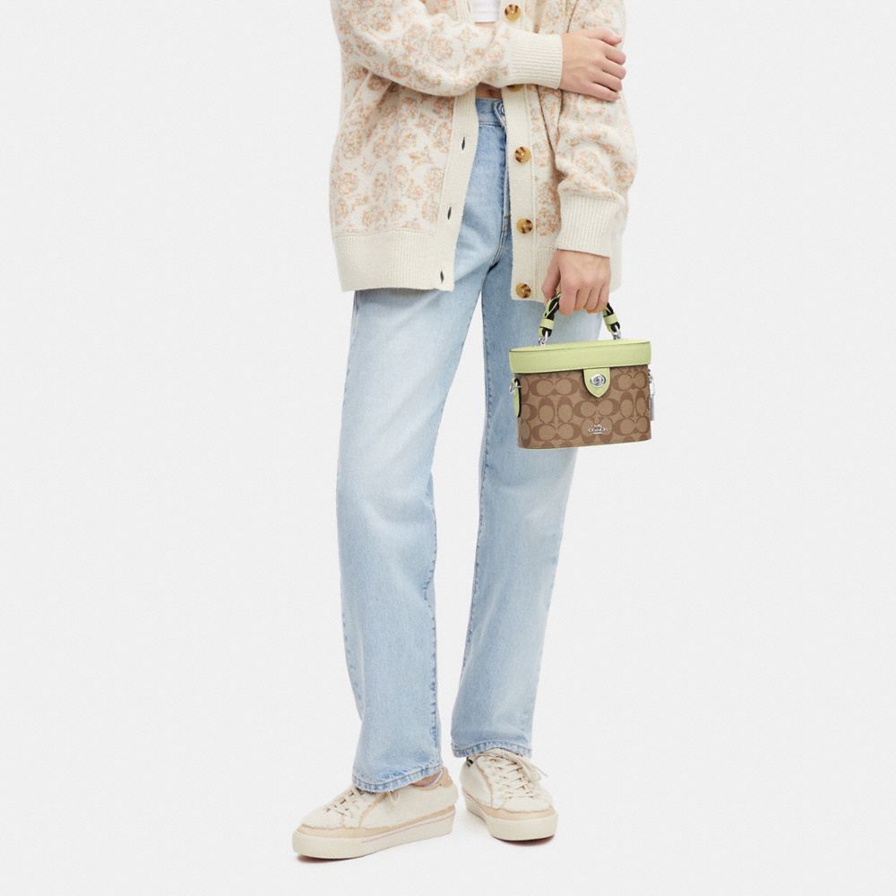 | Signature coated canvas and smooth leather | Inside multifunction pocket | Turnlock closure, fabric lining | Top handle with 2 1/2" drop | Detachable strap with 23 1/4" drop for shoulder or crossbody wear | 7 3/4" (L) x 5 1/4" (H) x 3 3/4" (W)|Style No. CJ613|