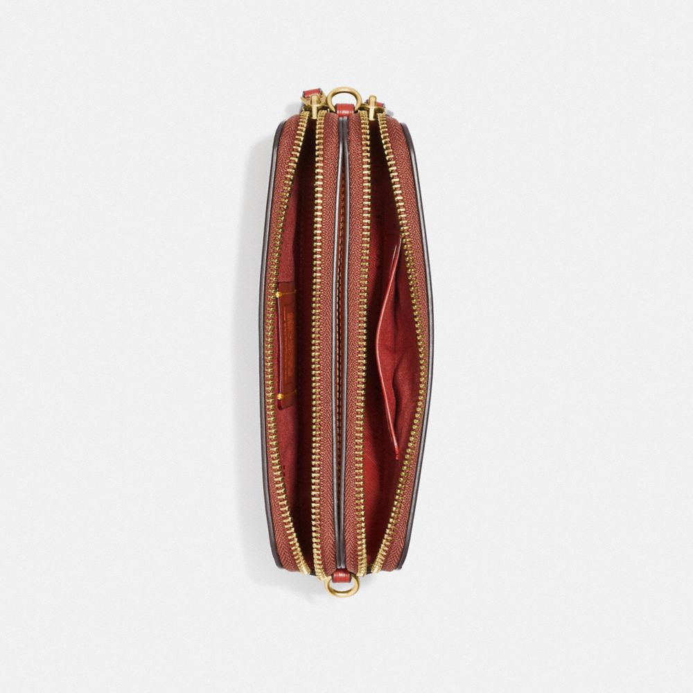 Signature textile jacquard and refined calf leather| Four credit card slots| Double zip closure, fabric lining| Center open compartment| Detachable wrist strap| Detachable long strap with 23" drop for shoulder or crossbody wear| 7 1/2" (L) x 4" (H) x 1 3/4" (W)| Coach Forever CollectionStyle No. C5392