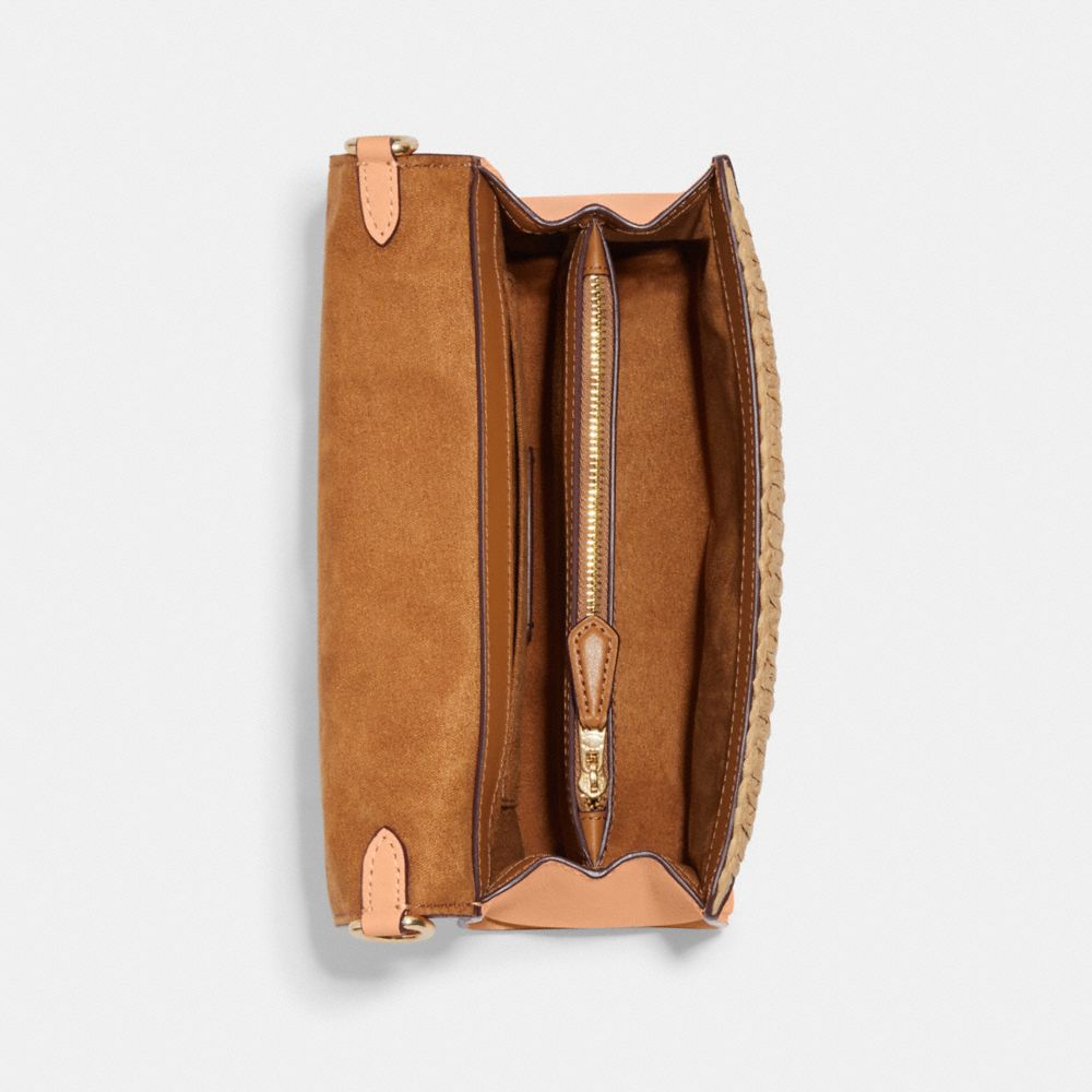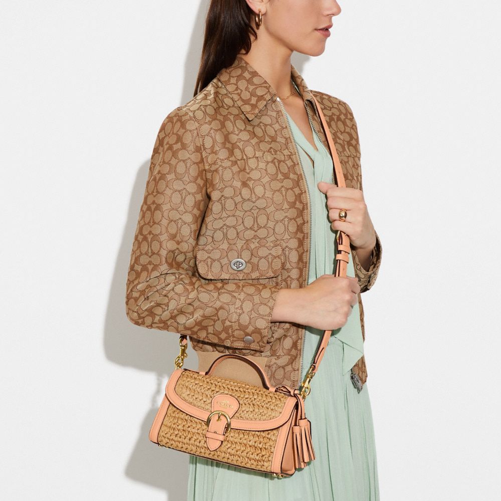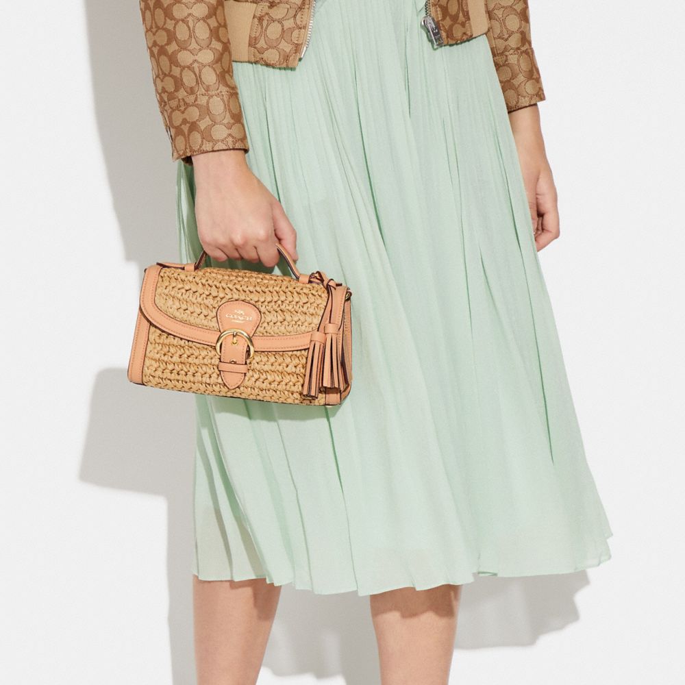 | Paper straw and smooth leather | Inside zip and multifunction pockets | Snap closure, fabric lining | Top handle with 1 3/4" drop | Outside open pocket | Detachable strap with 22 1/4" drop for shoulder or crossbody wear | Four protective feet at base | 9 1/4" (L) x 5" (H) x 3 1/4" (W)|Style No. CA154|