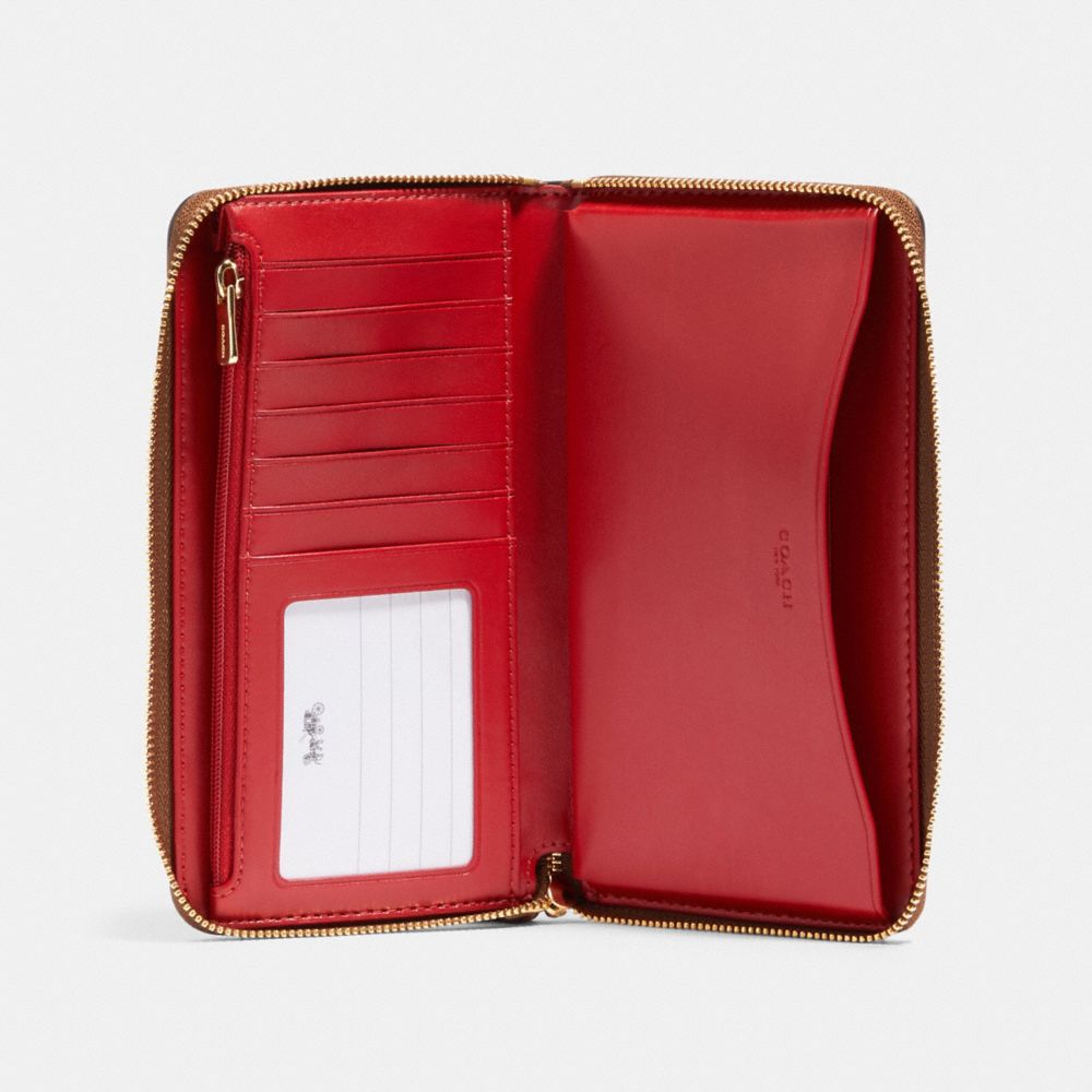Signature coated canvas with smooth leather details| Six credit card slots| ID window| Zip coin pocket| Inside phone pocket| Zip-around closure| Wrist strap attached| 7 1/4" (L) x 4" (H) x 3/4" (W)