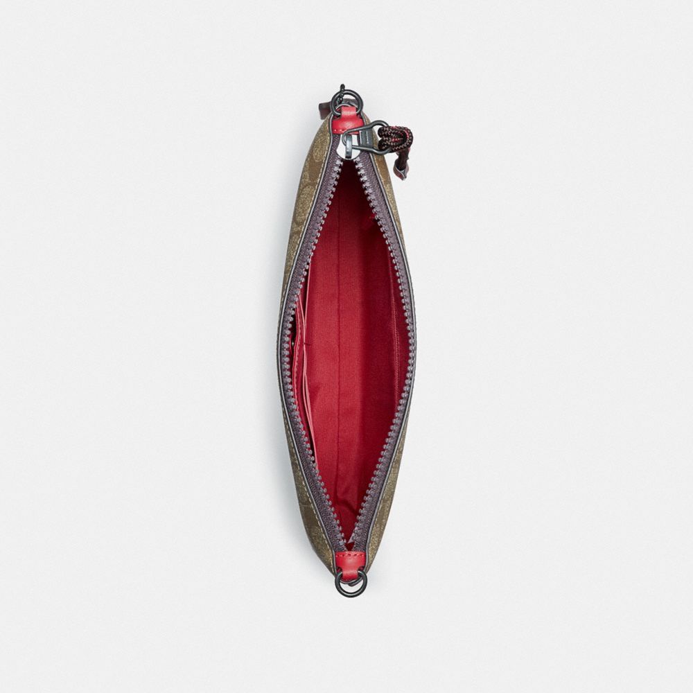 Signature coated canvas with smooth leather details| Six credit card slots| Inside zip and open pocket| Zip-top closure, fabric lining| Strap with clip to form a wrist strap or attach to the inside of a bag| 9 3/4" (L) x 6" (H) x 1 1/4" (W)