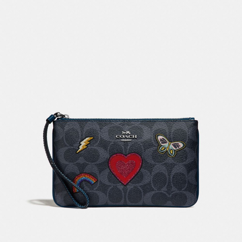 COACH FACTORY OUTLET PRICE CHART - F26650 - LARGE WRISTLET IN SIGNATURE CANVAS WITH SOUVENIR EMBROIDERY - SILVER/DENIM