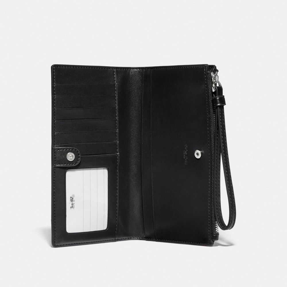 Printed coated canvas with smooth leather details| Six credit card slots| ID window| Full-length bill compartments| Zip coin pocket| Snap closure| Wrist strap attached| 7 1/2" (L) x 4" (H) x 3/4" (W)