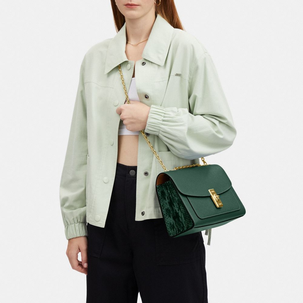 | Refined pebble leather and snake-embossed leather | Inside multifunction pocket | Center zip compartment | Turnlock closure, fabric lining | Outside open pocket | Handles convert to shoulder strap with 19 1/4" drop | 10 1/4" (L) x 7" (H) x 4" (W)|Style No. CK476|