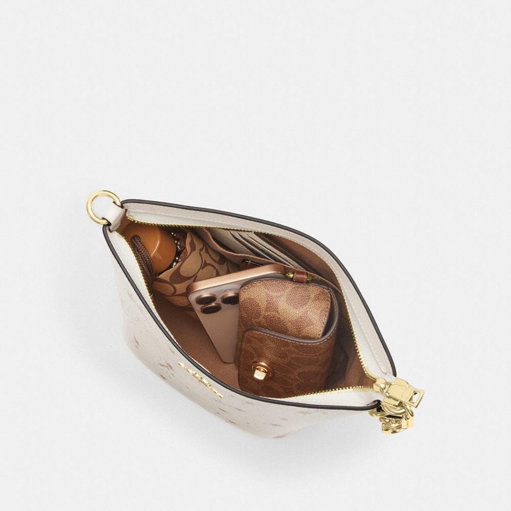 Printed coated canvas and smooth leather| Inside zip and multifunction pockets| Zip-top closure, fabric lining| Outside zip pocket| Detachable strap with 23 1/2" drop for shoulder or crossbody wear| 10" (L) x 8 1/4" (H) x 5 1/4" (W)|Style No. CCL32