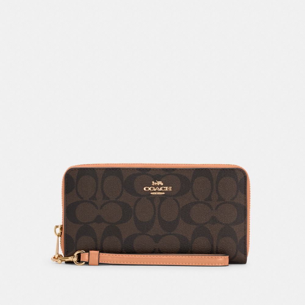 | Signature coated canvas and smooth leather | Twelve credit card slots | Full-length bill compartments | Inside zip coin pocket | Zip-around closure | Detachable wrist strap | 7 1/2" (L) x 4" (H) x 1" (W) | Fits all iPhone and Samsung Galaxy phones|Style No. C4452|