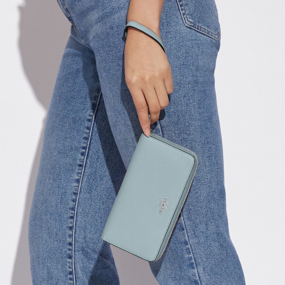| Crossgrain leather | Twelve credit card slots | Full-length bill compartments | Inside zip coin pocket | Zip-around closure | Detachable wrist strap | 7 1/2" (L) x 4" (H) x 1" (W) | Fits all iPhone and Samsung Galaxy phones|Style No. C3441|