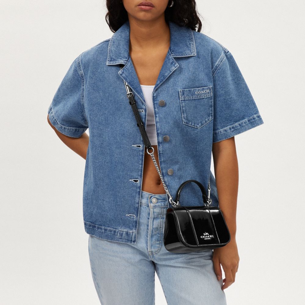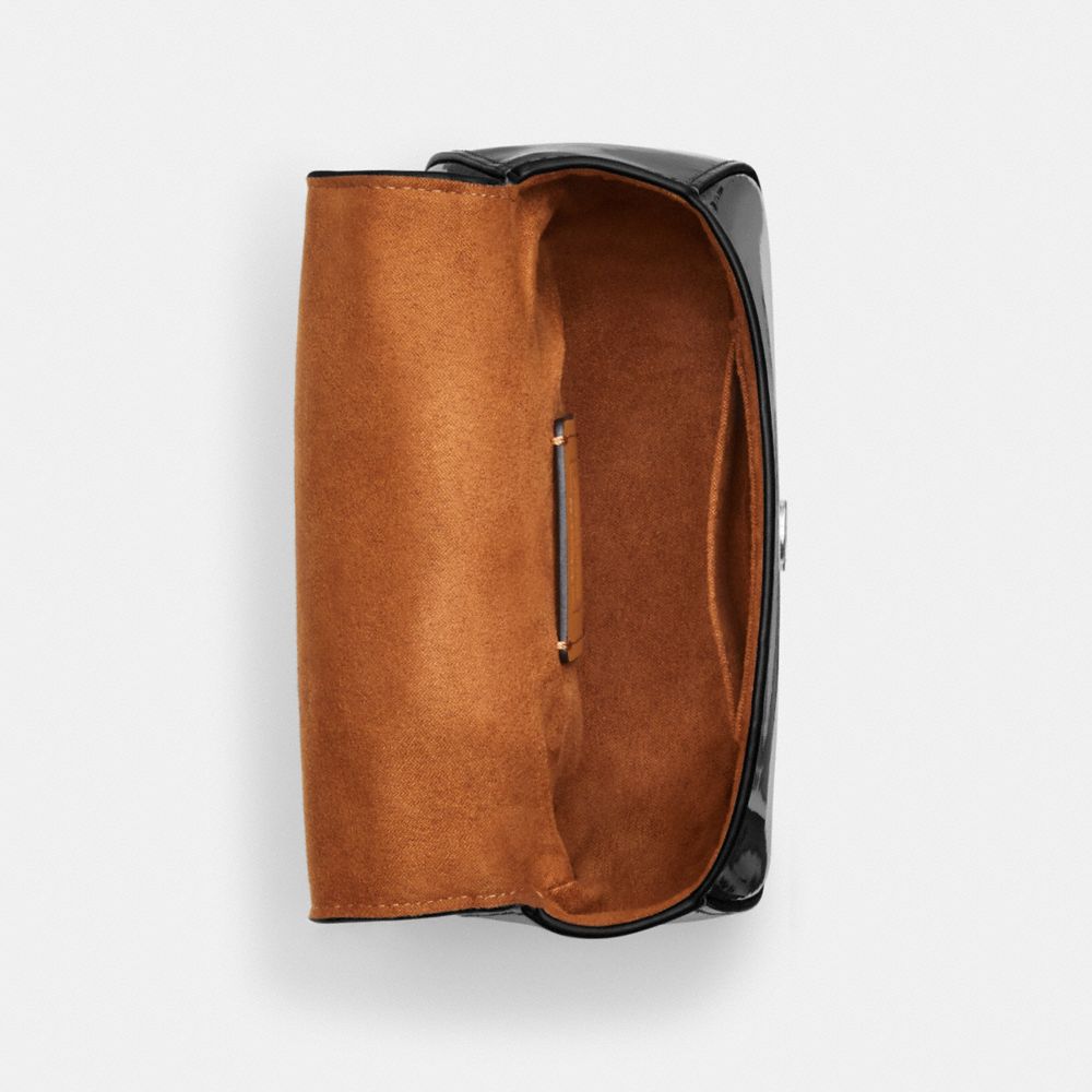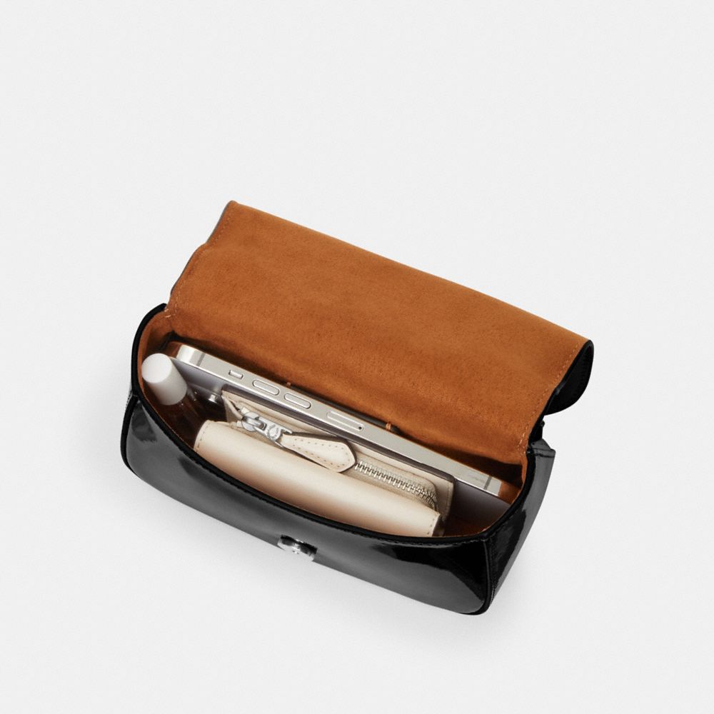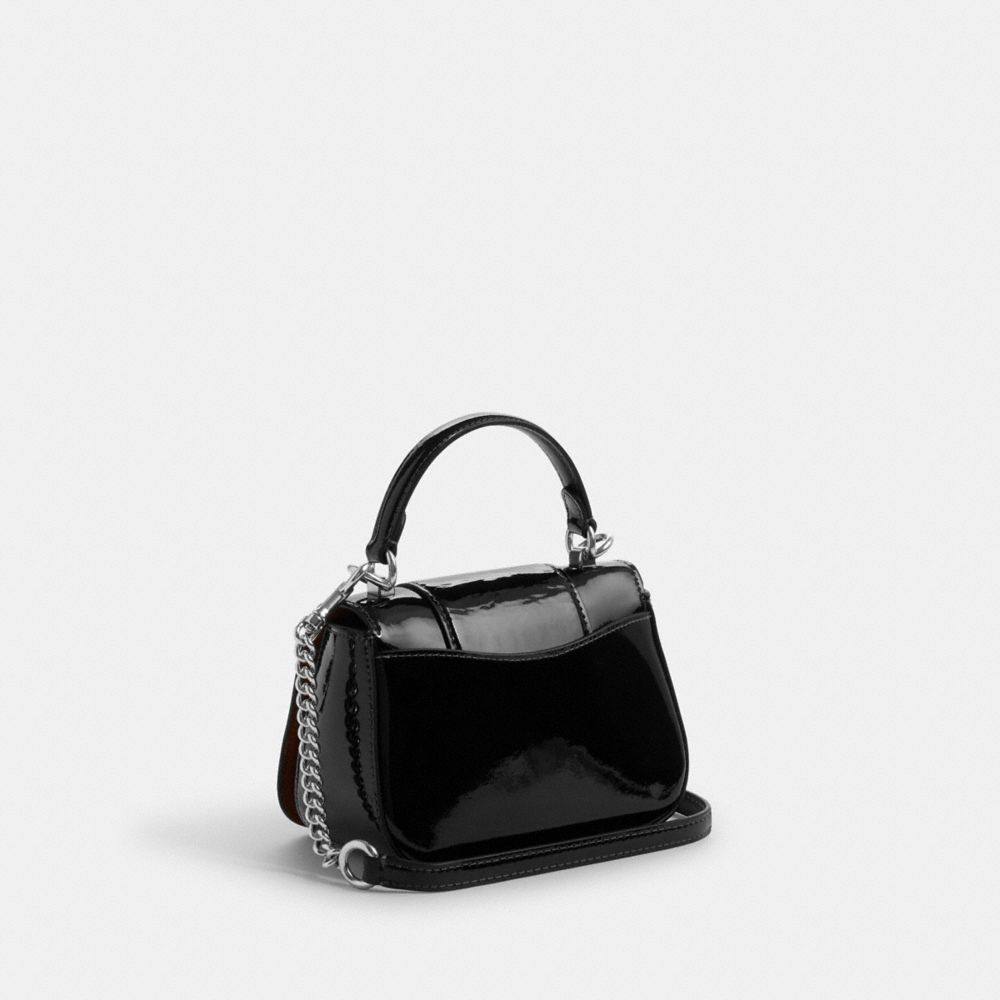 | Patent smooth leather and smooth leather | Two credit card slots | Snap closure, fabric lining | Top handle with 2 3/4" drop | Outside open pocket | Detachable strap with 22 3/4" drop for shoulder or crossbody wear | 7" (L) x 5" (H) x 3 1/4" (W)|Style No. CN579|
