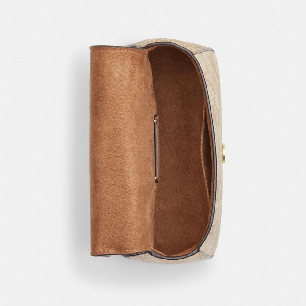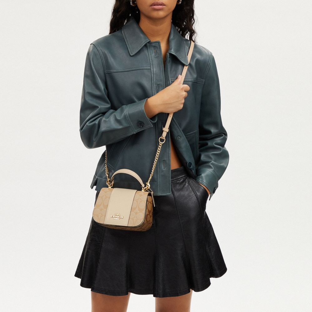 | Signature coated canvas and refined calf leather | Two credit card slots | Snap closure, fabric lining | Top handle with 2 3/4" drop | Outside open pocket | Detachable strap with 22 3/4" drop for shoulder or crossbody wear | 7" (L) x 5" (H) x 3 1/4" (W)|Style No. CM195|