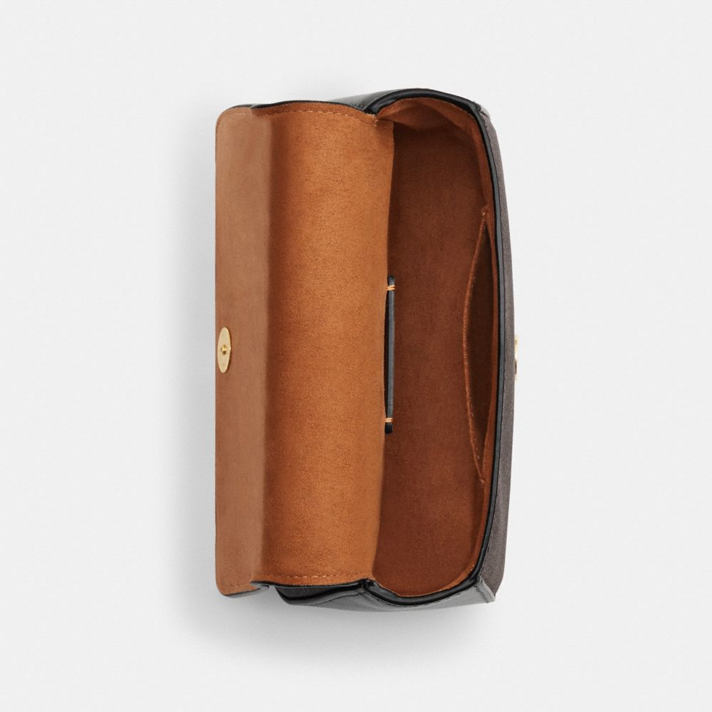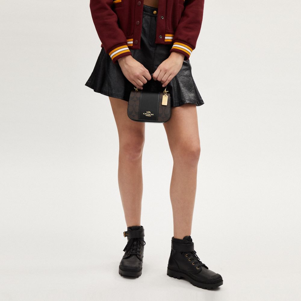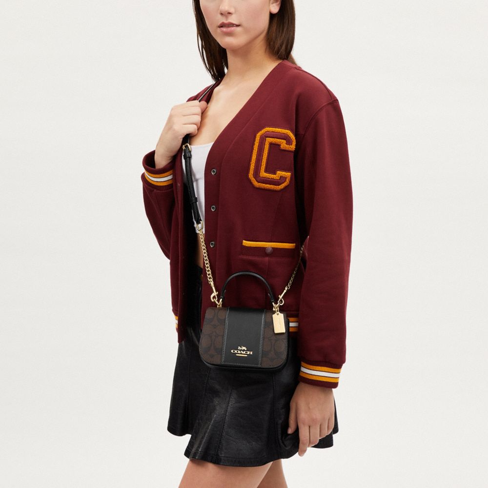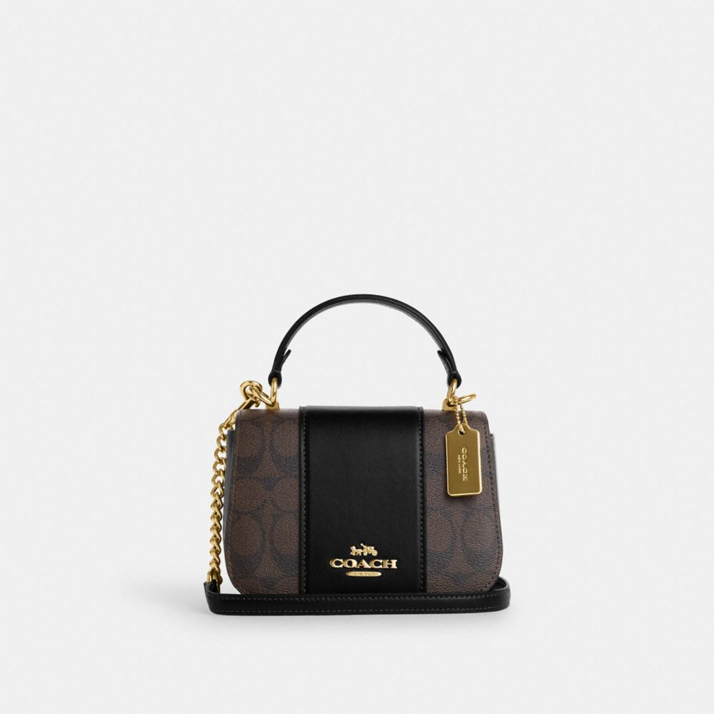 | Signature coated canvas and smooth leather | Two credit card slots | Snap closure, fabric lining | Top handle with 2 3/4" drop | Outside open pocket | Detachable strap with 22 3/4" drop for shoulder or crossbody wear | 7" (L) x 5" (H) x 3 1/4" (W)|Style No. CO965|