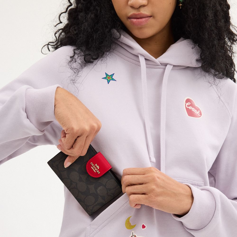 | Signature coated canvas | Trim partially made with recycled leather fiber layer | Seven credit card slots | Bill compartment | ID window | Snap closure | Zip coin pocket | 5" (L) x 3 1/2" (H) x 1/2" (W)|Style No. CW786|