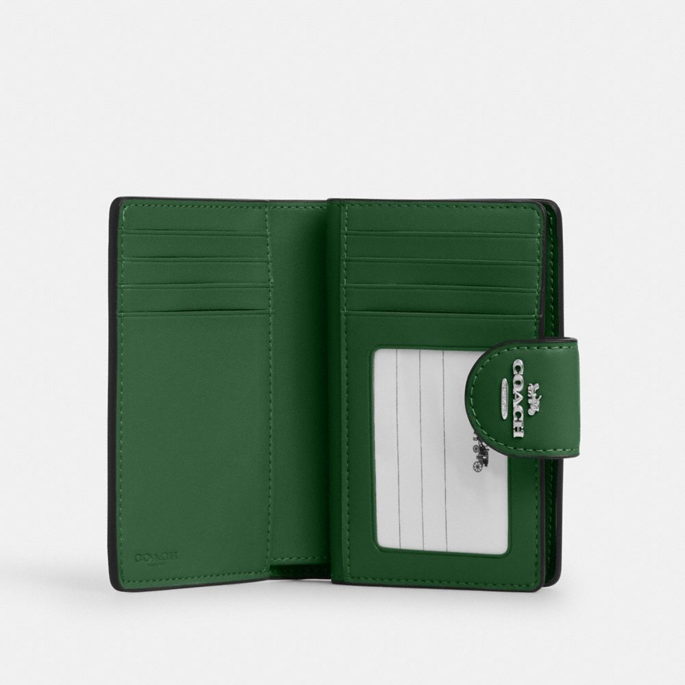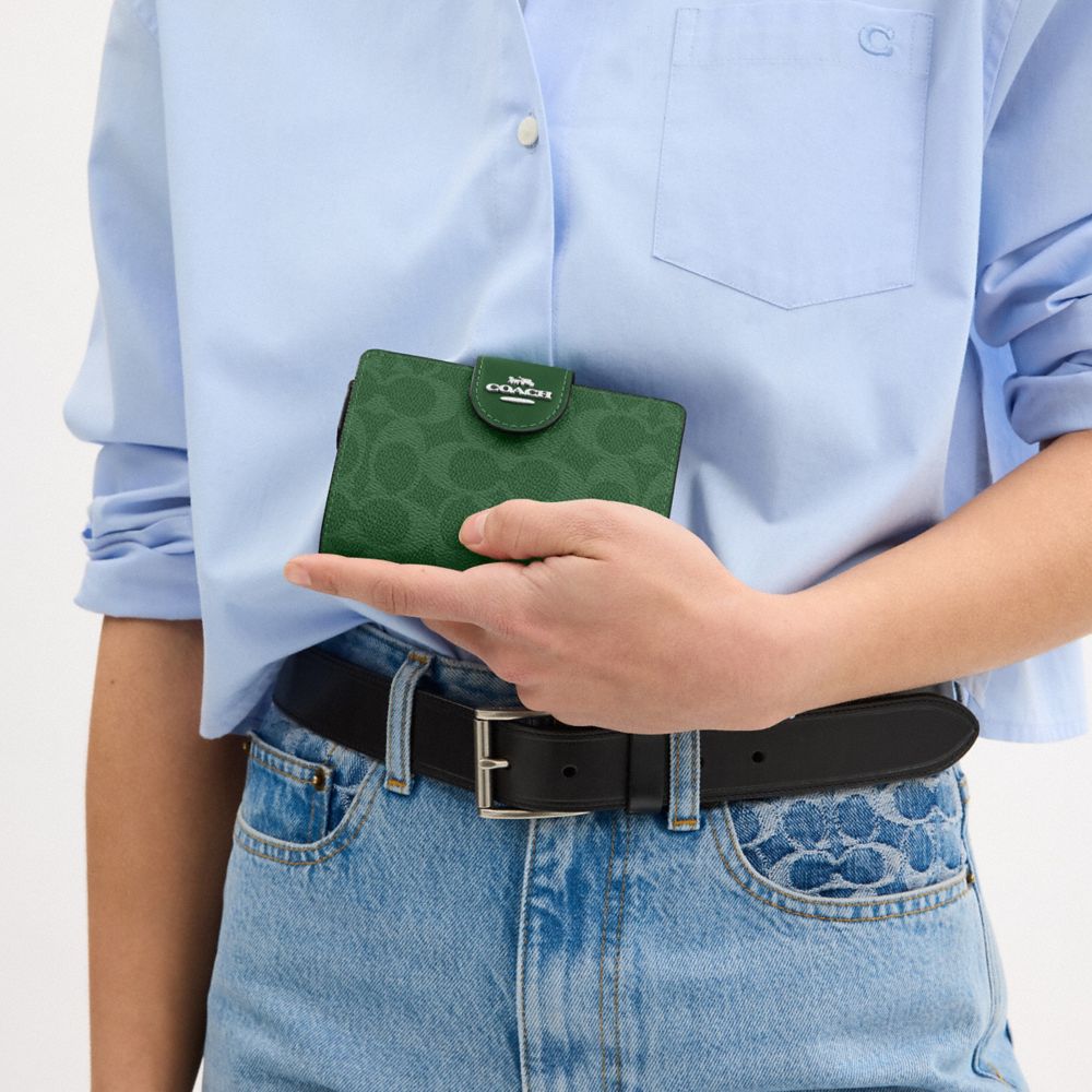 | Signature coated canvas | Trim partially made with recycled leather fiber layer | Seven credit card slots | Bill compartment | ID window | Snap closure | Zip coin pocket | 5" (L) x 3 1/2" (H) x 1/2" (W)|Style No. CW786|