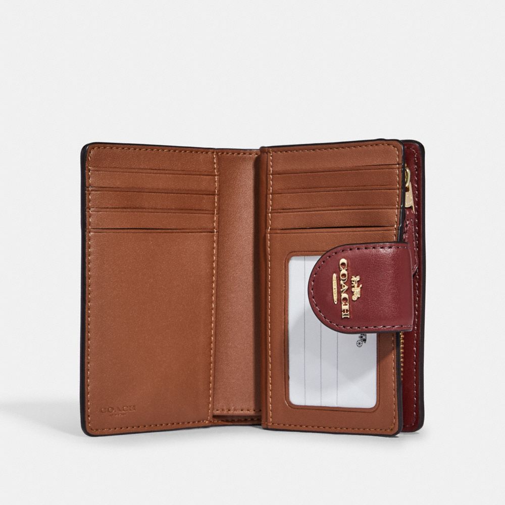 Signature coated canvas and smooth leather| Seven credit card slots| Bill compartment| ID window| Snap closure| Zip coin pocket| 5" (L) x 3 1/2" (H) x 1/2" (W)Style No. C8730