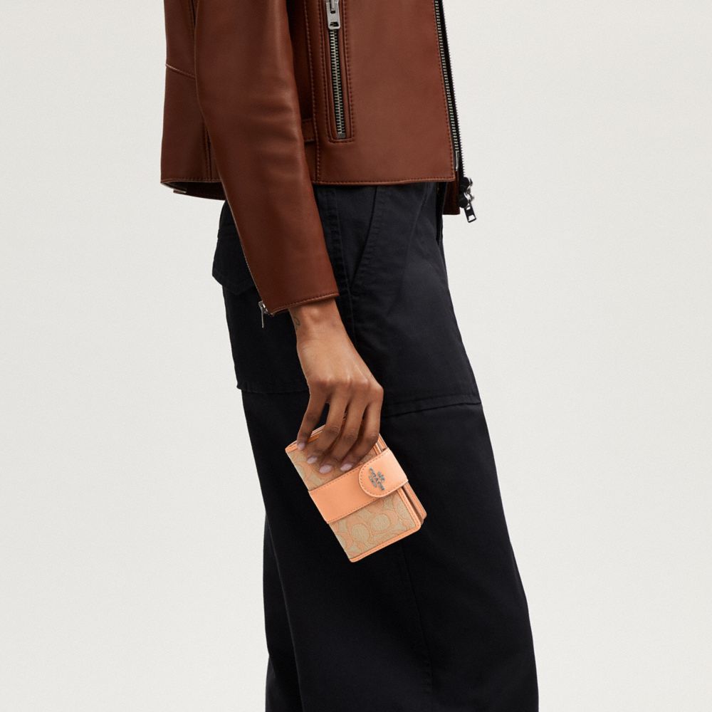 | Signature jacquard and refined calf leather | Seven credit card slots | Bill compartment | ID window | Snap closure | Zip coin pocket | 5" (L) x 3 1/2" (H) x 1/2" (W) | Exclusive of trim, this Coach piece is crafted of our Signature jacquard made from a blend of organic cotton and recycled polyester|Style No. CT922|