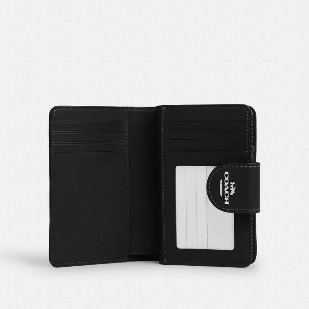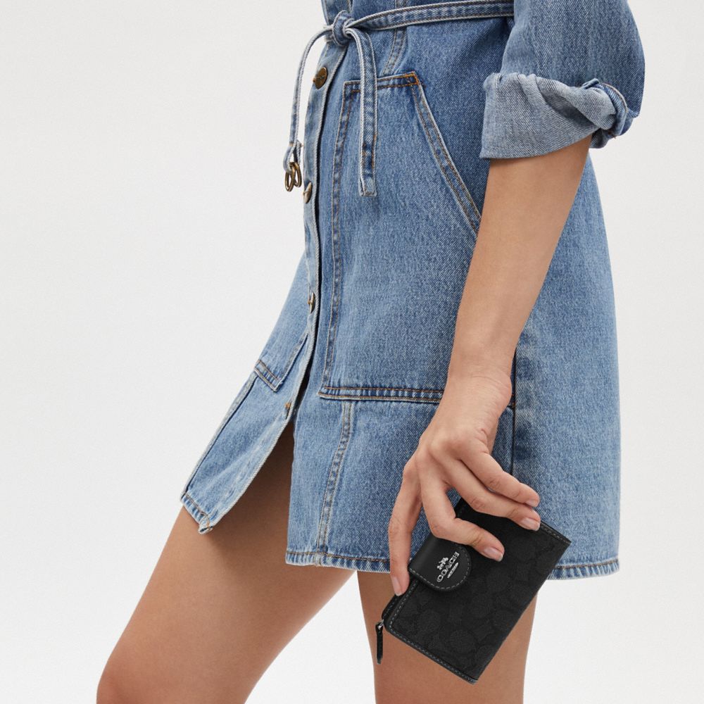 | Signature jacquard and soft refined calf leather | Seven credit card slots | Bill compartment | ID window | Snap closure | Zip coin pocket | 5" (L) x 3 1/2" (H) x 1/2" (W) | Exclusive of trim, this Coach piece is crafted of our Signature jacquard made from a blend of organic cotton and recycled polyester|Style No. CU402|