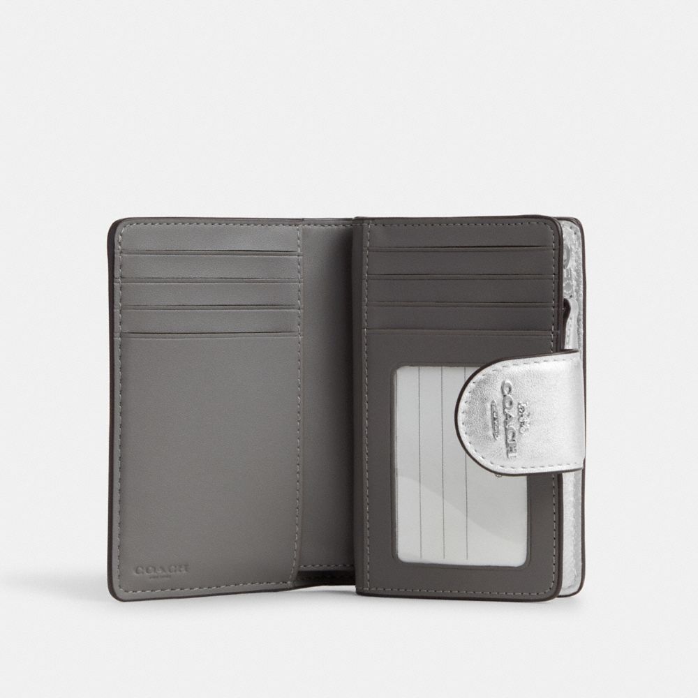 | Metallic smooth leather and metallic refined calf leather | Seven credit card slots | Bill compartment | ID window | Snap closure | Zip coin pocket | 5" (L) x 3 1/2" (H) x 1/2" (W)|Style No. CM998|