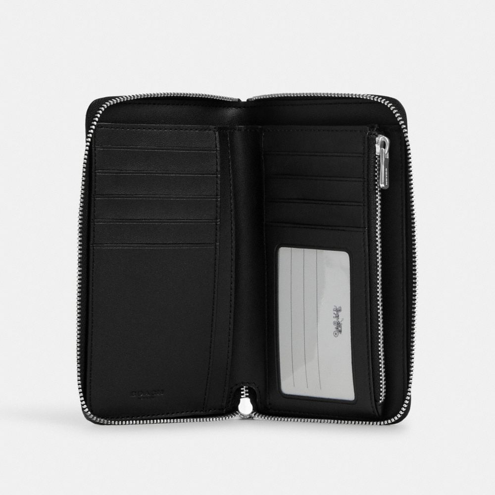 | Signature coated canvas and smooth leather | Eight credit card slots | Bill compartments | ID window | Zip coin pocket | Zip-around closure | 6 1/2" (L) x 3 3/4" (H) x 3/4" (W)|Style No. CL672|