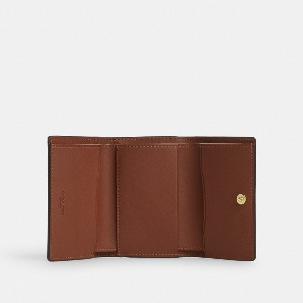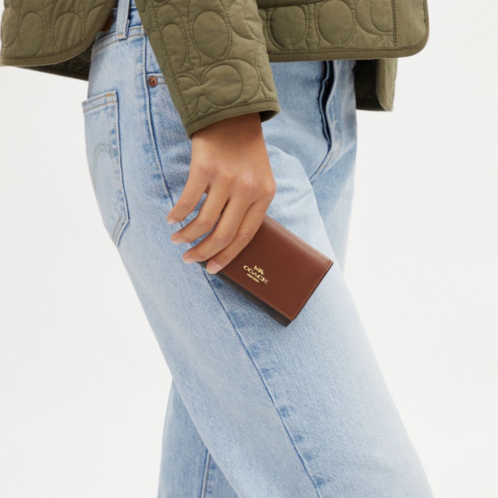 | Signature coated canvas and smooth leather | Three credit card slots | Full-length bill compartment | Snap closure | Zip coin pocket | 4" (L) x 3" (H) x 1 1/4" (W)|Style No. CM761|