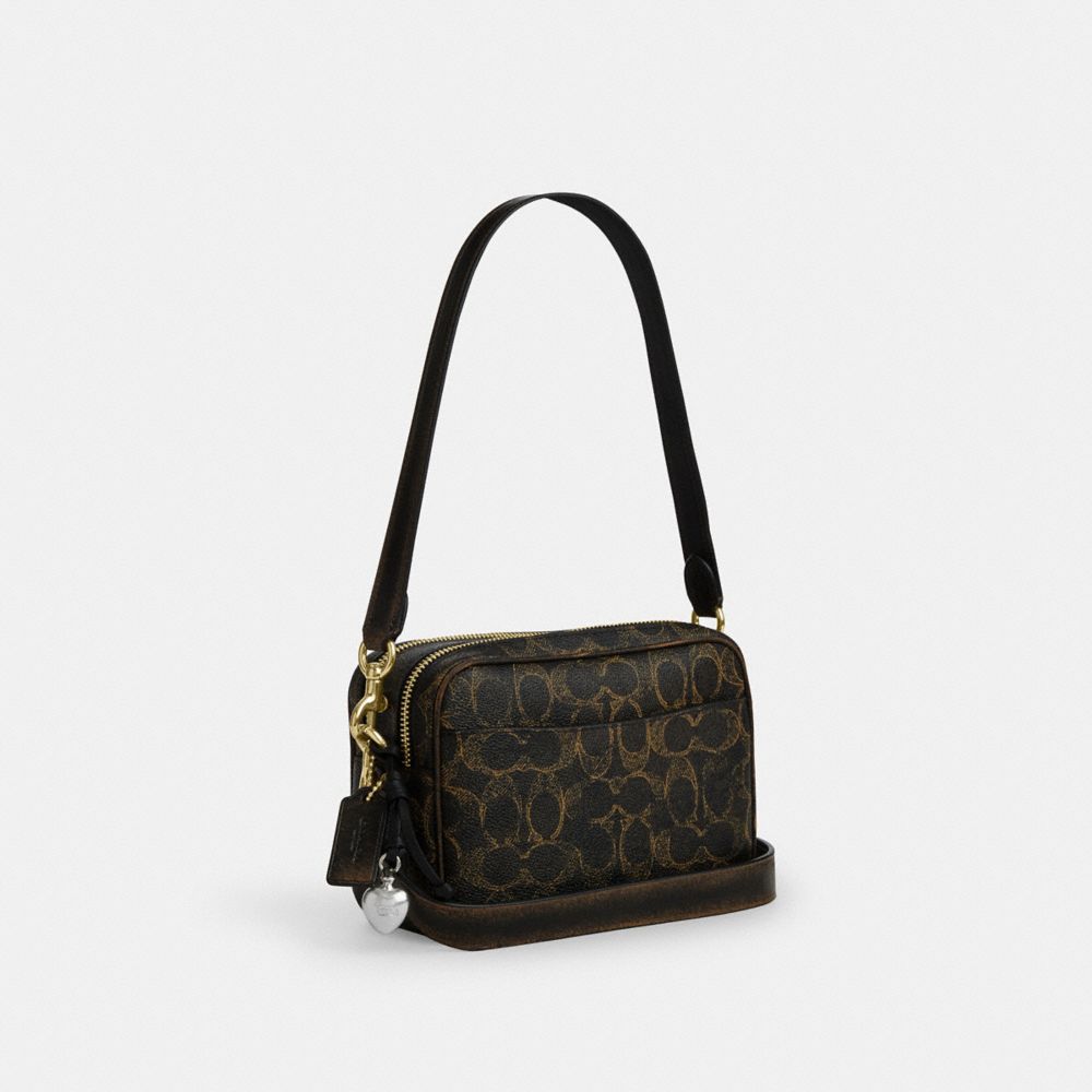 Signature coated canvas, rub-off smooth leather and smooth leather| Two credit card slots| Inside snap pocket| Double zip closure, recycled polyester lining| Detachable handle with 8 3/4" drop| Outside magnetic snap pocket| Detachable strap with 21 3/4" drop for shoulder or crossbody wear| 7 1/4" (L) x 5" (H) x 2 3/4" (W)| Canvas specially treated for a love-worn look|Style No. CEK73