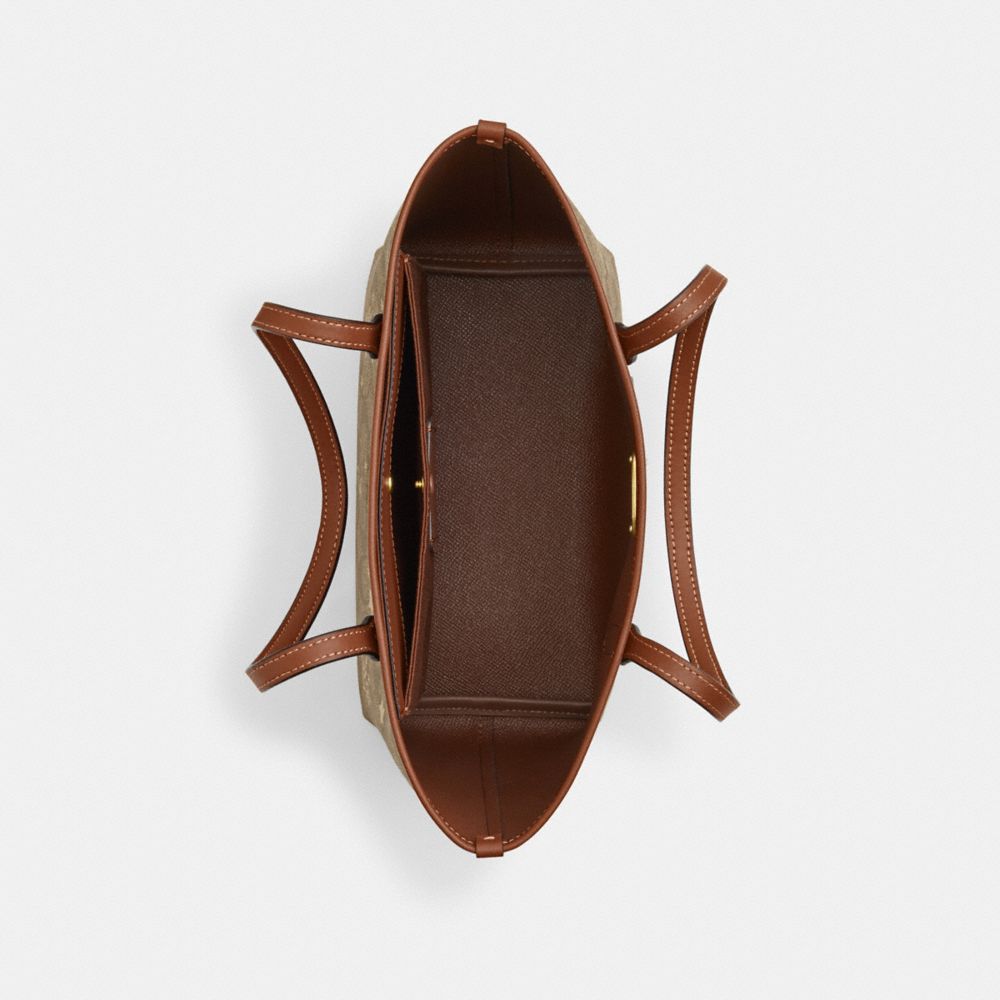 | Signature coated canvas and smooth leather | Inside snap pocket | Handles with 7" drop | 9" (L) x 8" (H) x 4 1/4" (W)|Style No. CN682|