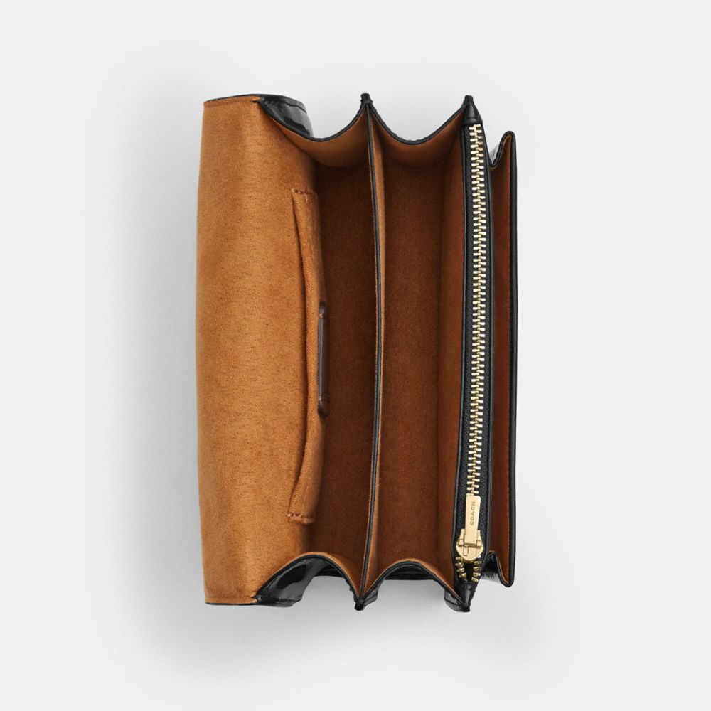| Patent leather and smooth leather | Inside multifunction and zip pockets | Snap closure, fabric lining | Outside open pocket | Handles convert to shoulder strap with 22" drop | 7" (L) x 5 1/4" (H) x 2" (W)|Style No. CV425|