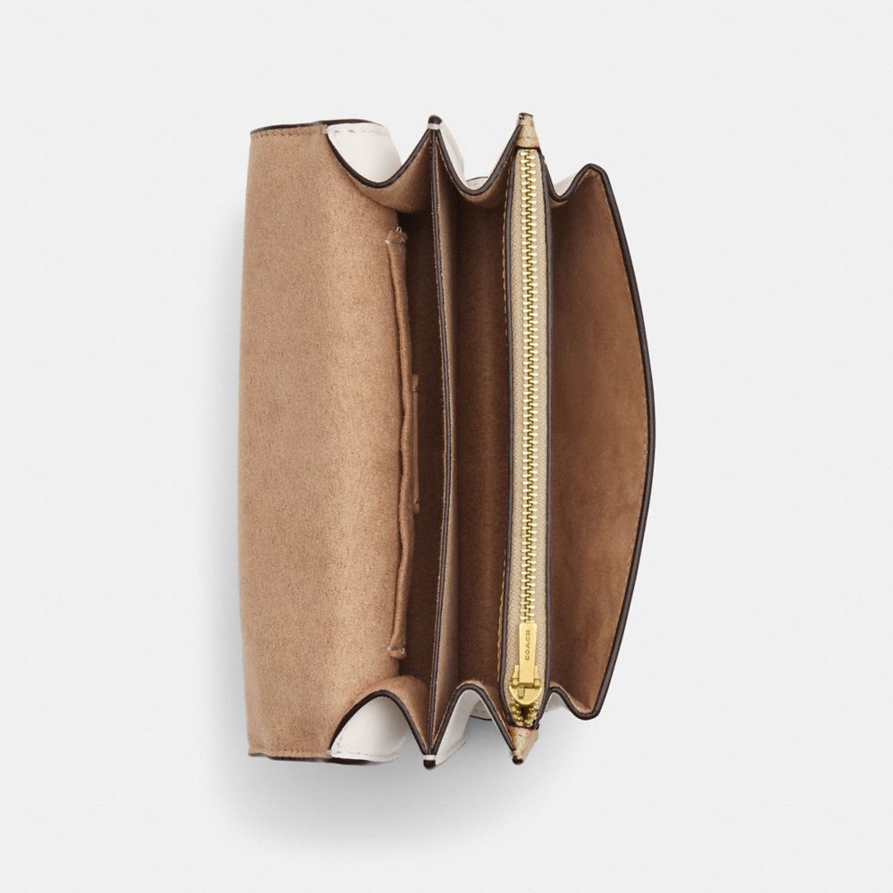 | Signature coated canvas and smooth leather | Inside multifunction and zip pockets | Snap closure, fabric lining | Outside open pocket | Handles convert to shoulder strap with 22" drop | 7" (L) x 5 1/4" (H) x 2" (W)|Style No. CO950|