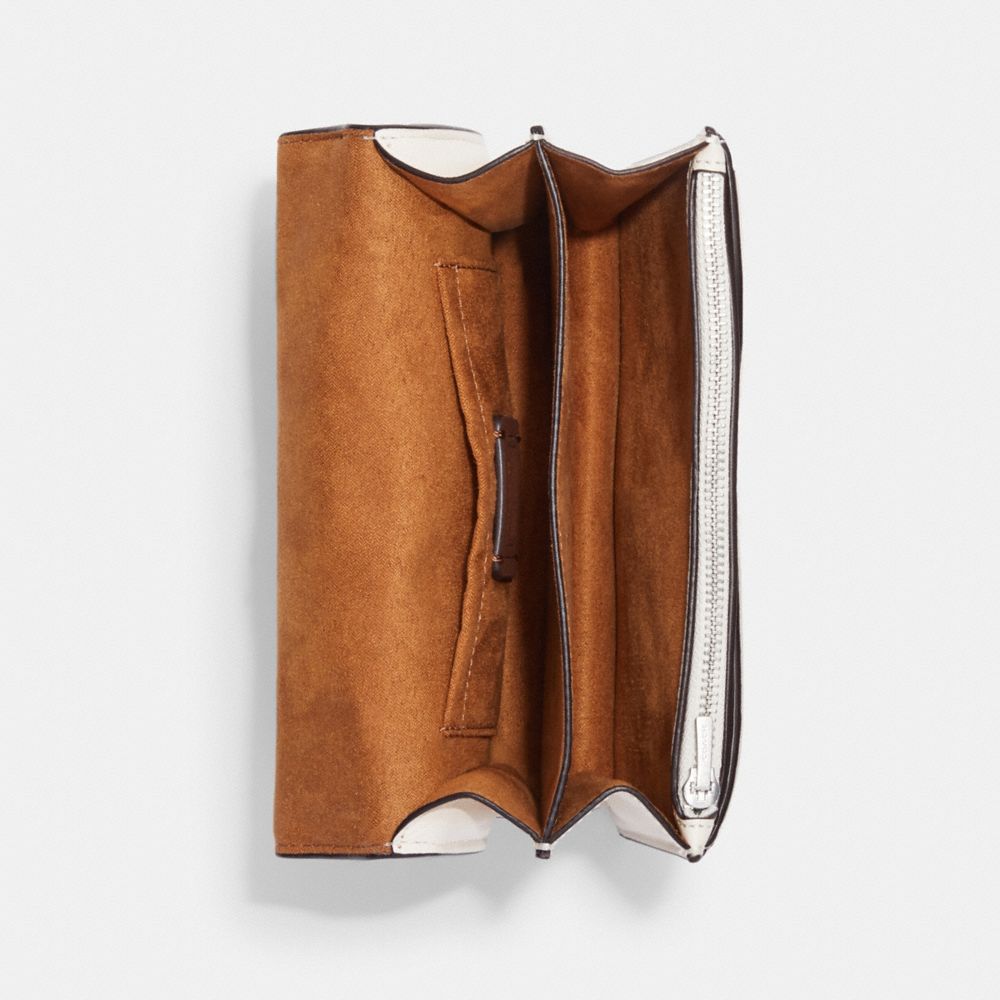 | Signature coated canvas and smooth leather | Inside multifunction and zip pockets | Snap closure, fabric lining | Outside open pocket | Handles convert to shoulder strap with 22" drop | 7" (L) x 5 1/4" (H) x 2" (W)|Style No. CJ723|