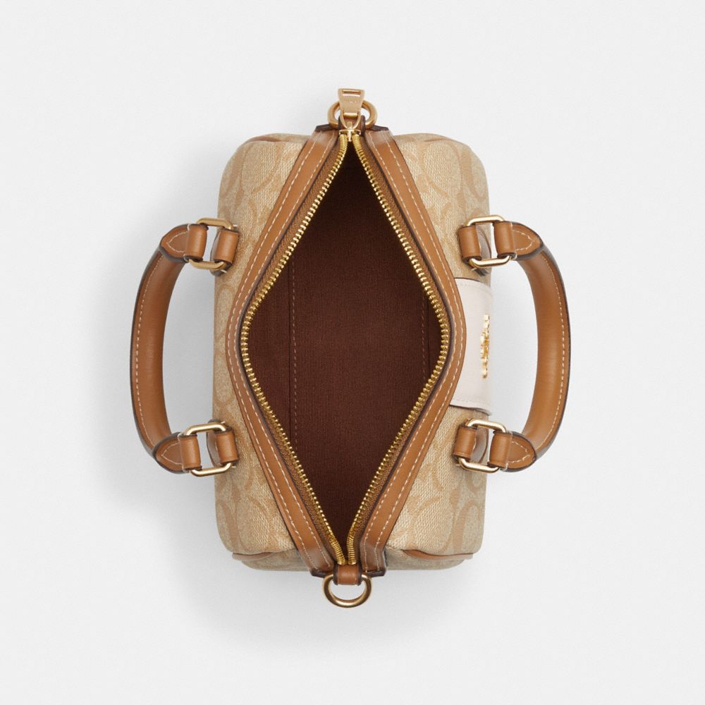 | Signature coated canvas, recycled leather and smooth leather | Two credit card slots | Zip-top closure, fabric lining | Handles with 2 3/4" drop | Detachable strap with 23 1/2" drop for shoulder or crossbody wear | 7" (L) x 4 3/4" (H) x 4" (W)|Style No. CR243|