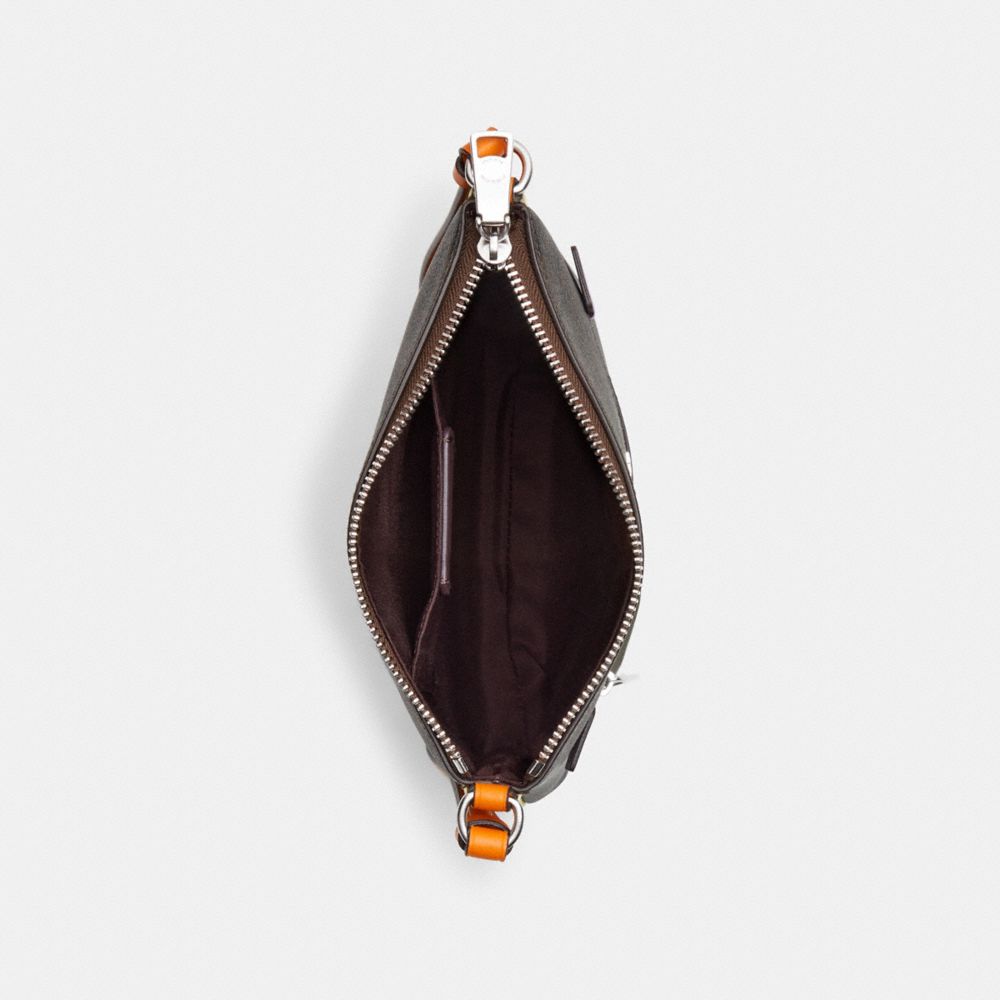 | Signature coated canvas and smooth leather | Inside multifunction pocket | Zip-top closure, fabric lining | Outside zip pocket | Adjustable strap with 22" drop for shoulder or crossbody wear | 8 1/4" (L) x 8 1/4" (H) x 1 1/4" (W)|Style No. CL671|