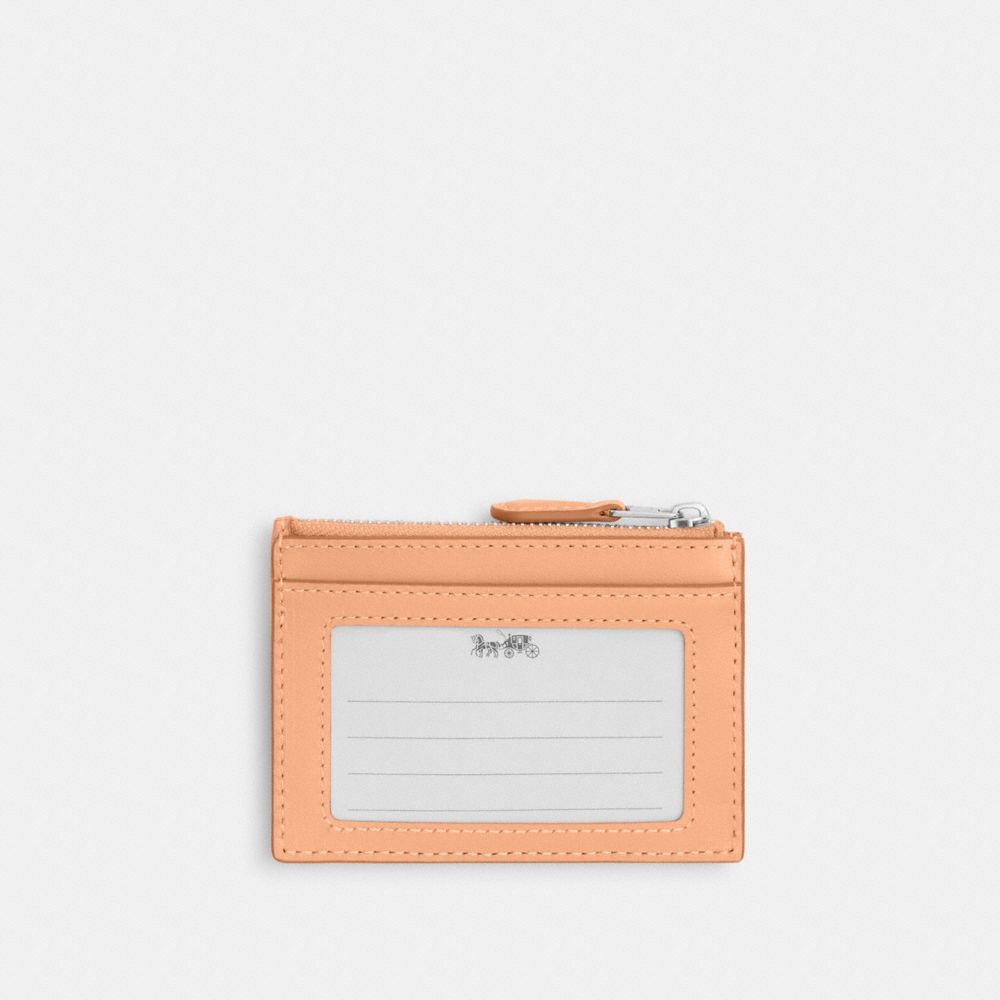 | Signature jacquard and refined calf leather | Two credit card slots | ID window | Zip-top closure, fabric lining | Attached split key ring | 4 1/4" (L) x 3" (H) x 1/2" (W) | Exclusive of trim, this Coach piece is crafted of our Signature jacquard made from a blend of organic cotton and recycled polyester|Style No. CT994|