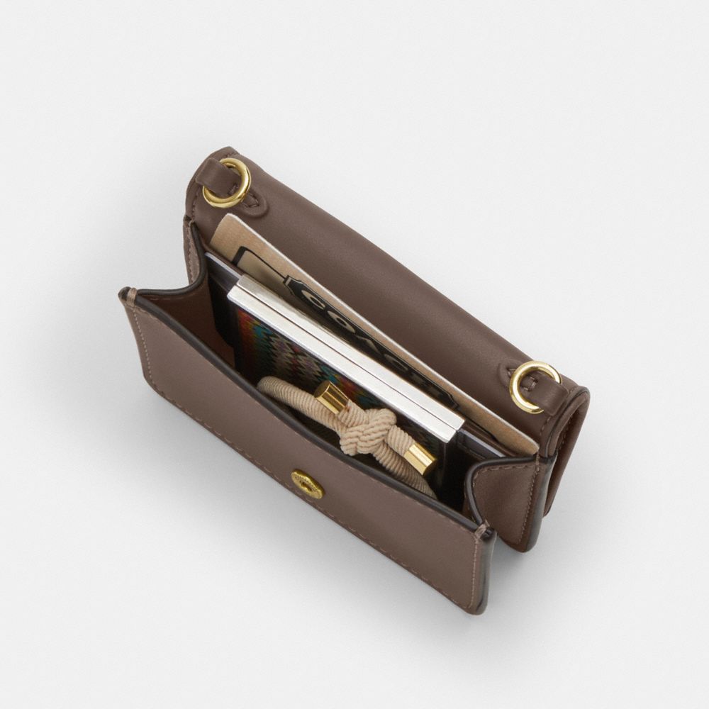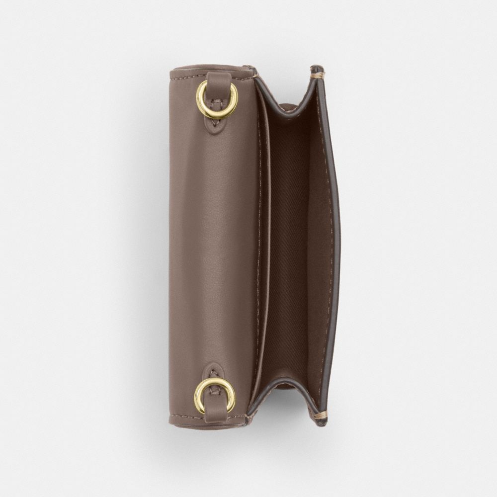 Signature jacquard and smooth leather| Two credit card slots| Snap closure, recycled polyester lining| Outside open pocket| Detachable chain strap with 23 1/4" drop for shoulder or crossbody wear| 4" (L) x 3" (H) x 1" (W)|Style No. CEF60