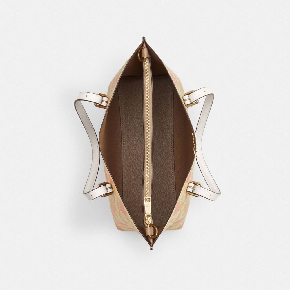 | Signature coated canvas and smooth leather | Zip-top closure, fabric lining | Side open compartments | Handles with 4 3/4" drop | Detachable strap with 22" drop for shoulder or crossbody wear | 9 3/4" (L) x 7 1/2" (H) x 4 3/4" (W)|Style No. CP057|