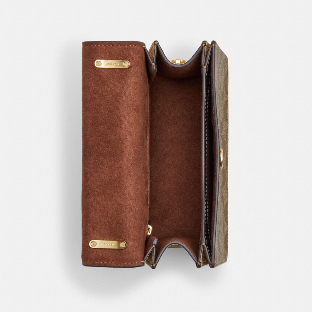| Signature coated canvas, refined pebble leather and smooth leather | Inside zip and multifunction pockets | Snap closure, fabric lining | Outside open pocket | Adjustable strap with 21 1/2" drop for shoulder or crossbody wear | 7 1/4" (L) x 5 3/4" (H) x 2 1/4" (W)|Style No. CL462|