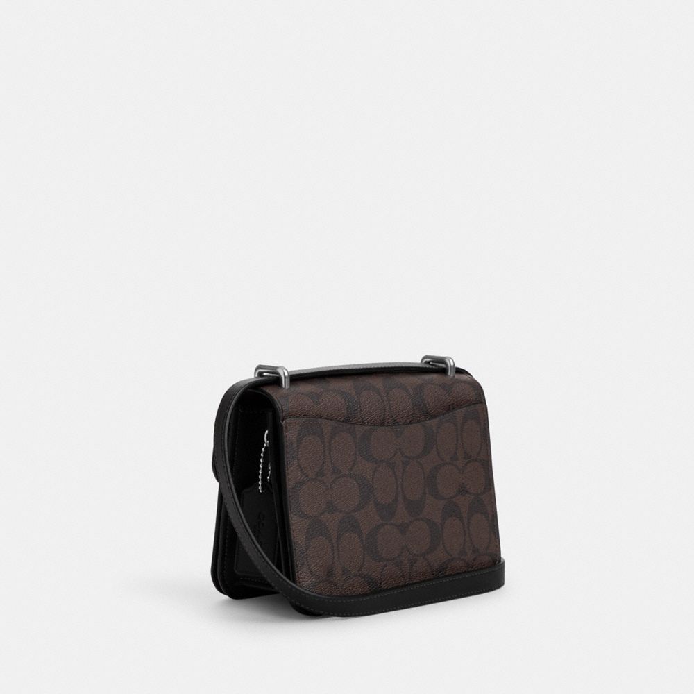 | Signature coated canvas and smooth leather | Inside zip and multifunction pockets | Snap closure, fabric lining | Outside open pocket | Adjustable strap with 21 1/2" drop for shoulder or crossbody wear | 7 1/4" (L) x 5 3/4" (H) x 2 1/4" (W)|Style No. CL415|